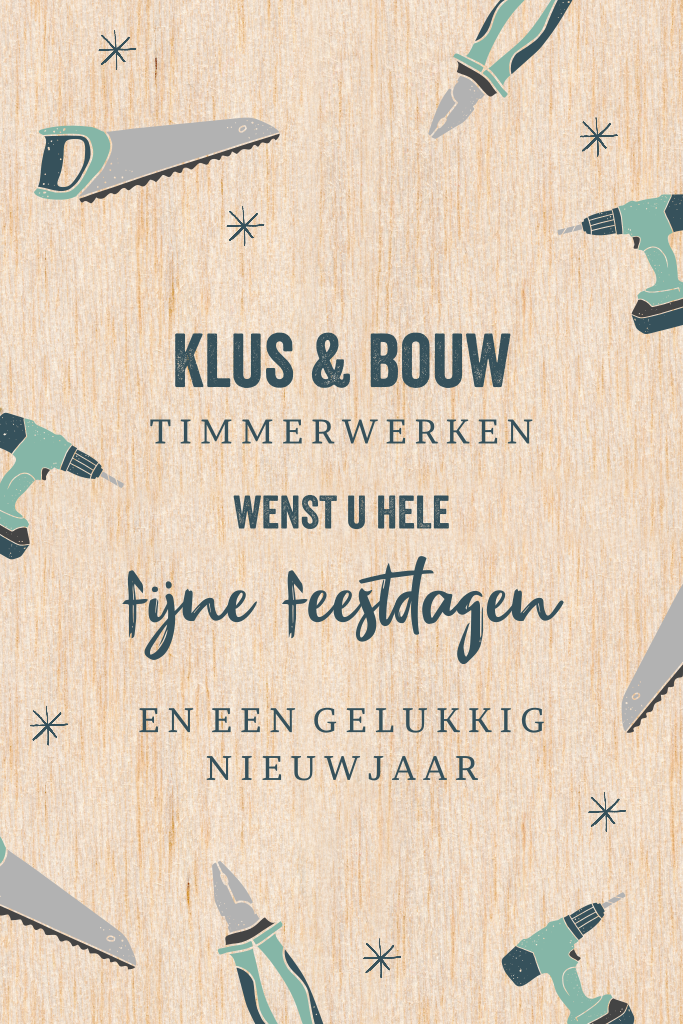 Een zakelijke kerstkaart van hout. Op de kaart staan verschillende gereedschappen zoals een zaag en een boor. De houten kaart heeft ronde hoeken.
