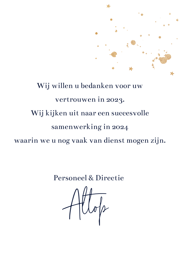 Een mooie, zakelijke kerstkaart met gouden cijfers en confetti op een donkerblauwe achtergrond.