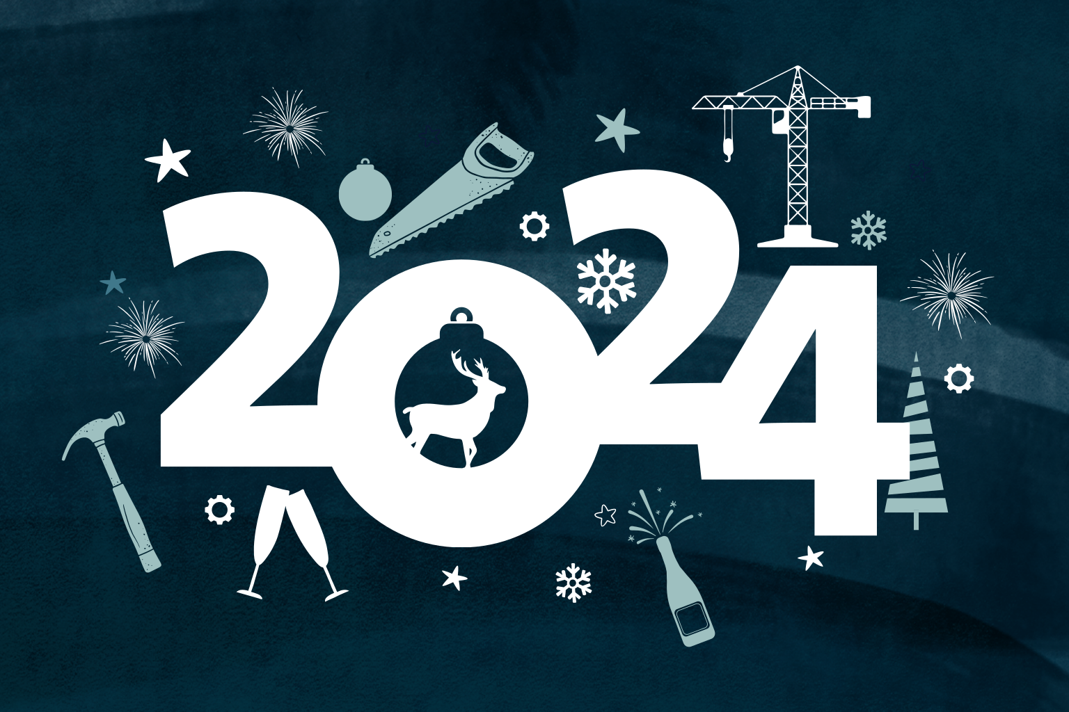Een zakelijke kerstkaart met verschillende elementen die gerelateerd zijn aan de bouwsector. Details zijn van goudfolie en in de editor is een logo toe te voegen.