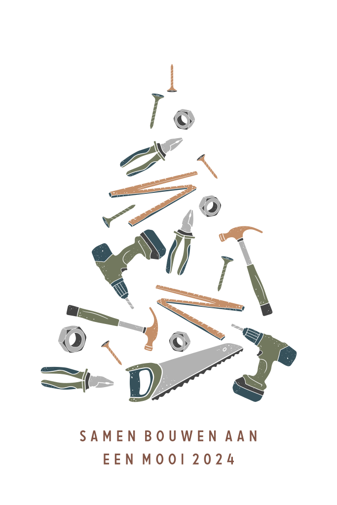 Een zakelijke kerstkaart met kerstboom die is gevormd door verschillende gereedschappen. In de editor is het mogelijk om een logo toe te voegen.
