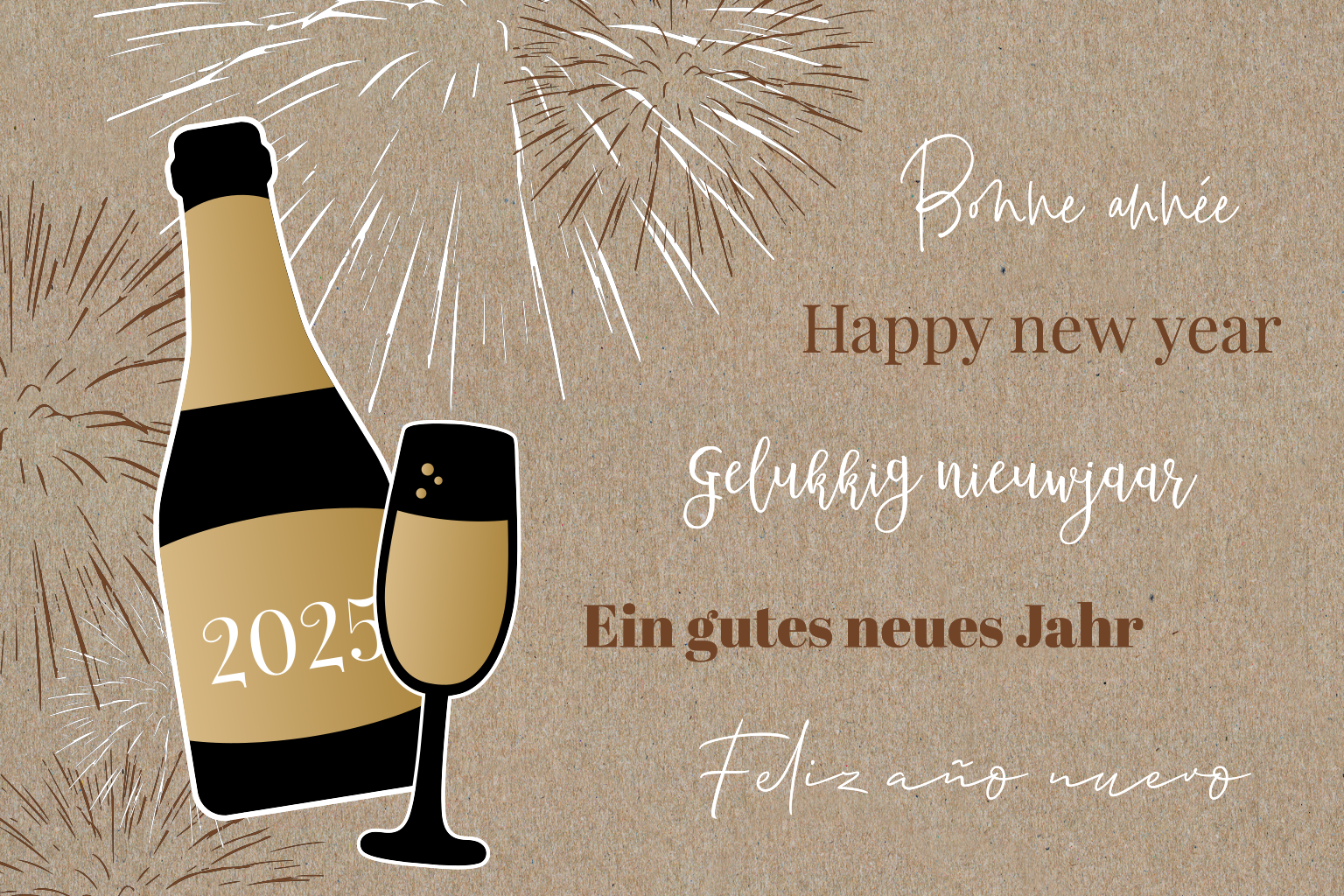 Zakelijke nieuwjaarskaart met champagnefles en vuurwerk