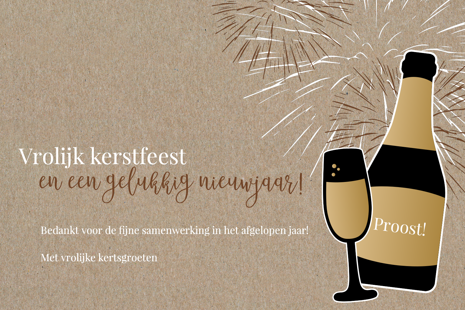 Een prachtige nieuwjaarskaart met een feestelijke champagnefles en vuurwerk. Pas de kaart volledig naar je eigen wensen in onze online editor en wens je collega's een fijne jaarwisseling.