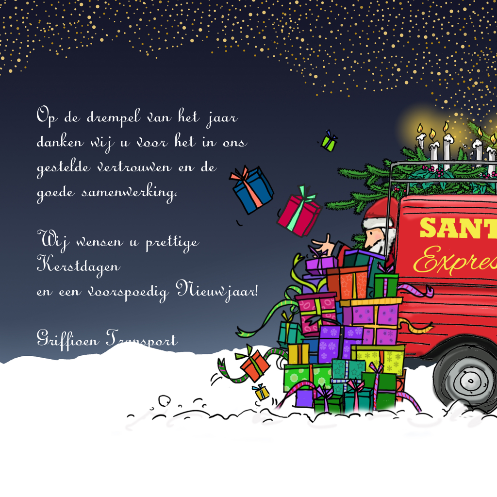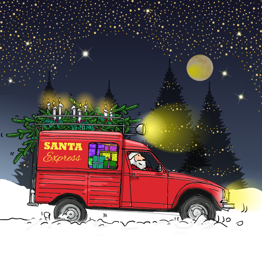 In de sneeuw staat de goede, oude kerstman met zijn bestelbusje vol kadootjes voor iedereen! Boven op de rode wagen zijn kersttakken met kaarsen, op de achtergrond een prachtige maan en twinkelende sterren met daaromheen een wolk van magische, goudkleurige stipjes. Wat een sfeervolle kerstkaart!
