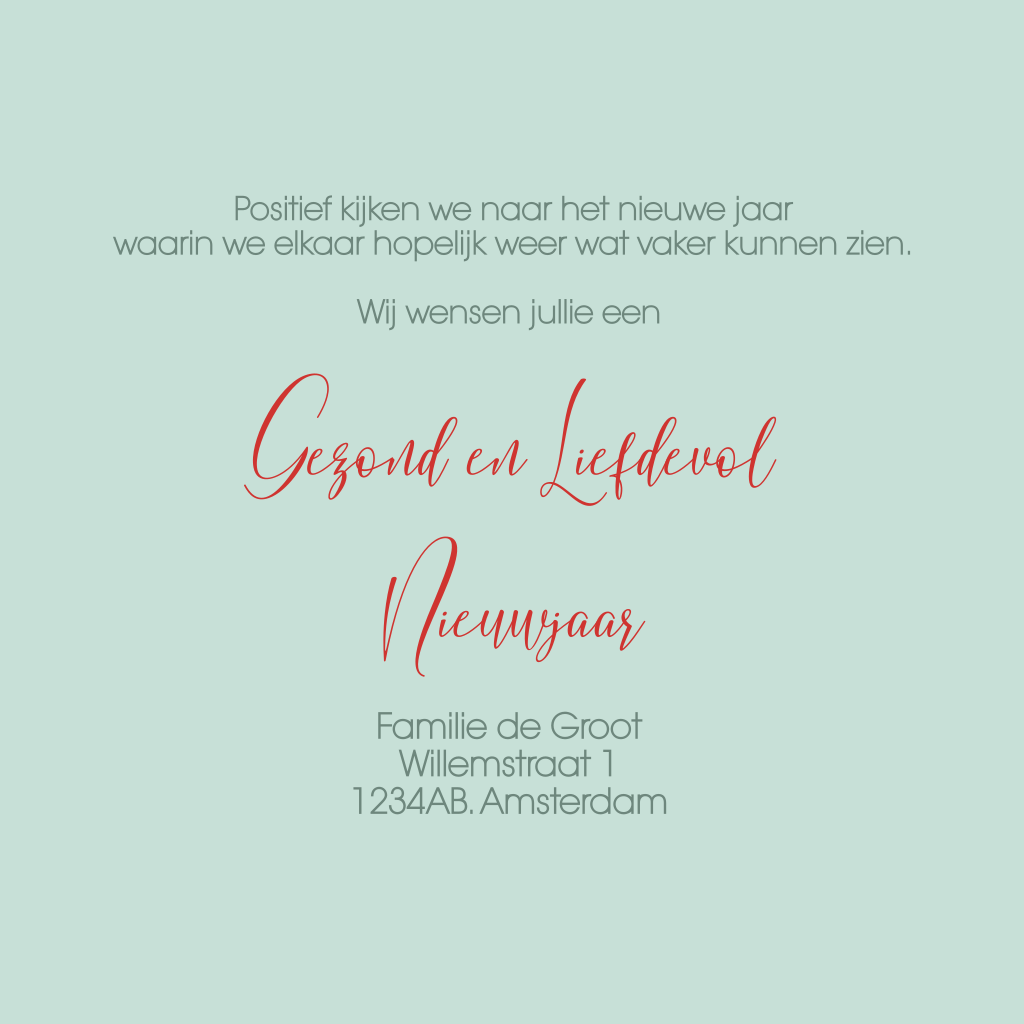 Een vierkante groene kerstkaart met mooie takjes en lieve tekst in sierlijke letters. In onze online editor kan je de kaart volledig personaliseren.