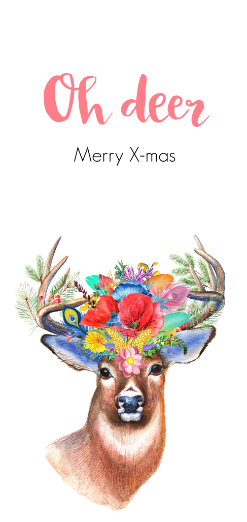 Oh deer! Dit rendier heeft een vrolijk kapsel van kleurrijke bloemen en dennentakjes. Deze hippe en originele kerstkaart kun je persoonlijk maken door eigen teksten op de achterkant te zetten. Ook kun je eventueel een achtergrondkleur kiezen en lettertypes aanpassen.