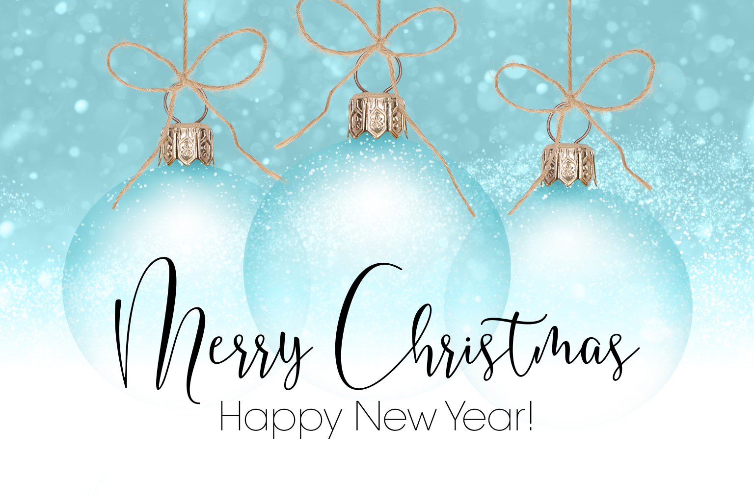 Een mooi sfeervol kaartje met doorzichtige blauwe kerstballen en sneeuw.