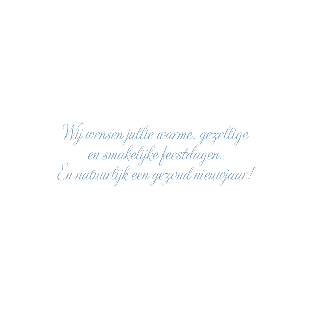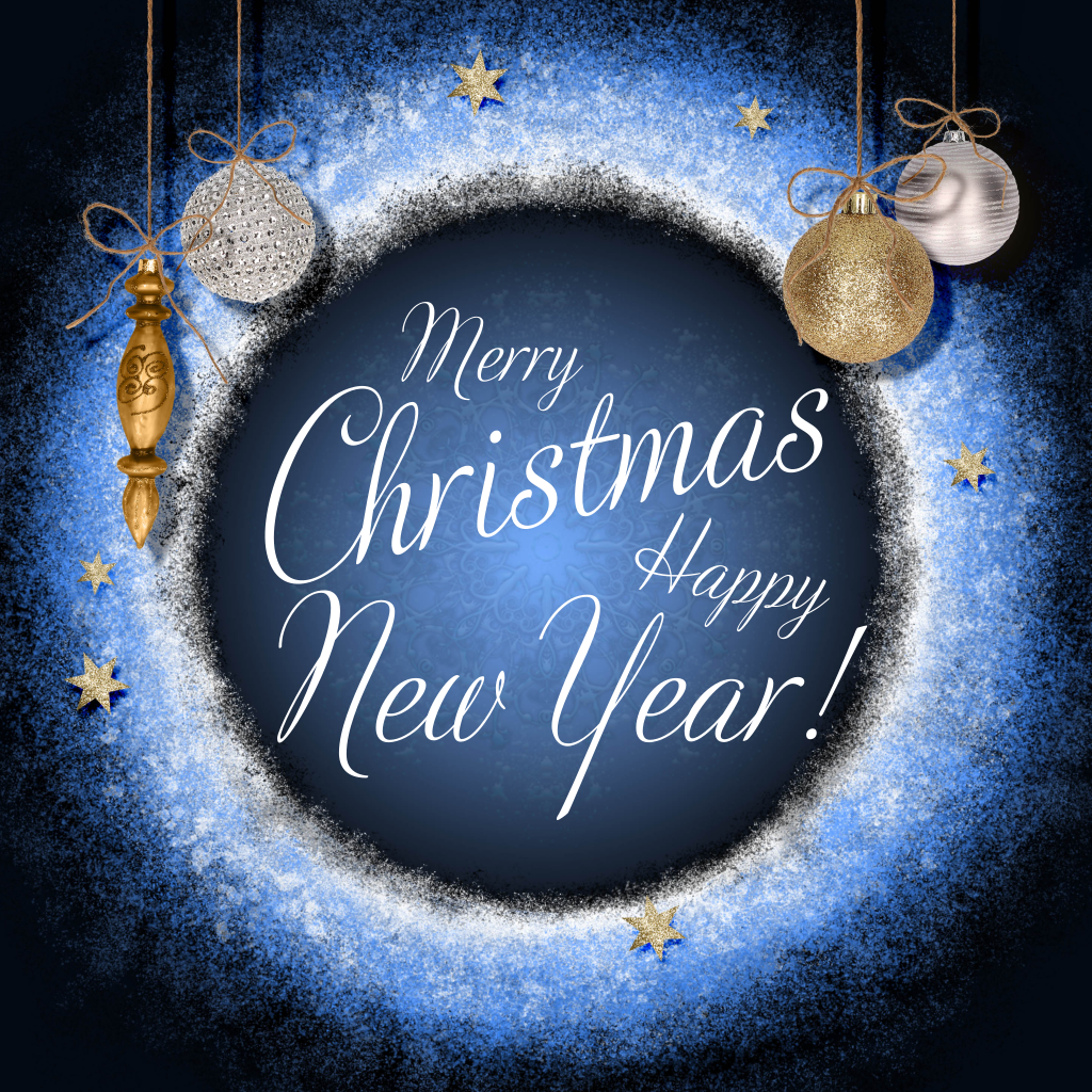 Een vrolijke sfeervolle kerstkaart met kerstballen, sterren en een blauwe maan.
