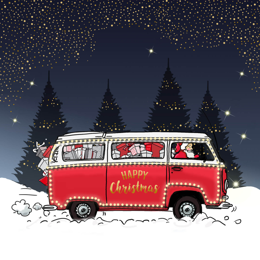 Midden in de nacht rijdt de kerstman met zijn rode busje volgeladen met kado's door een dik pak sneeuw. De lucht en de kerstbomen zijn versierd met goudkleurige stipjes, wat dit illustratieve kerstkaartje een magische uitstraling geeft. Happy Christmas!
