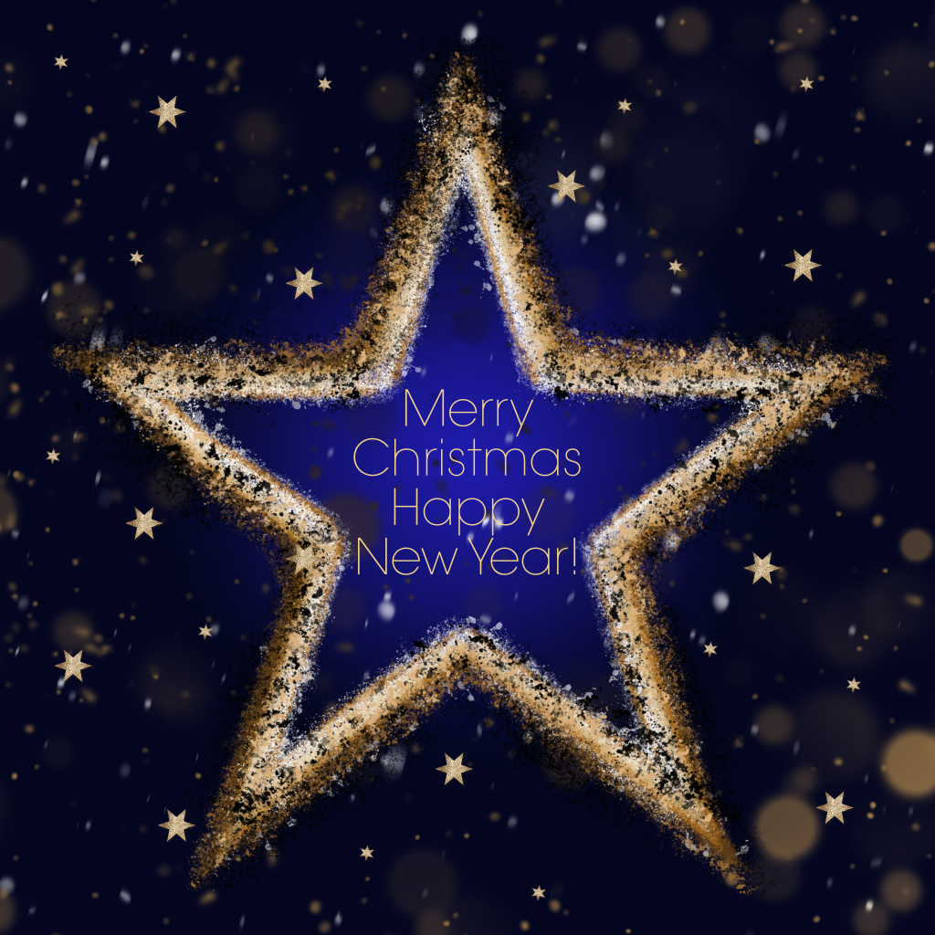 Een feestelijke kerstkaart met gouden kerstster op een warm blauwe achtergrond.