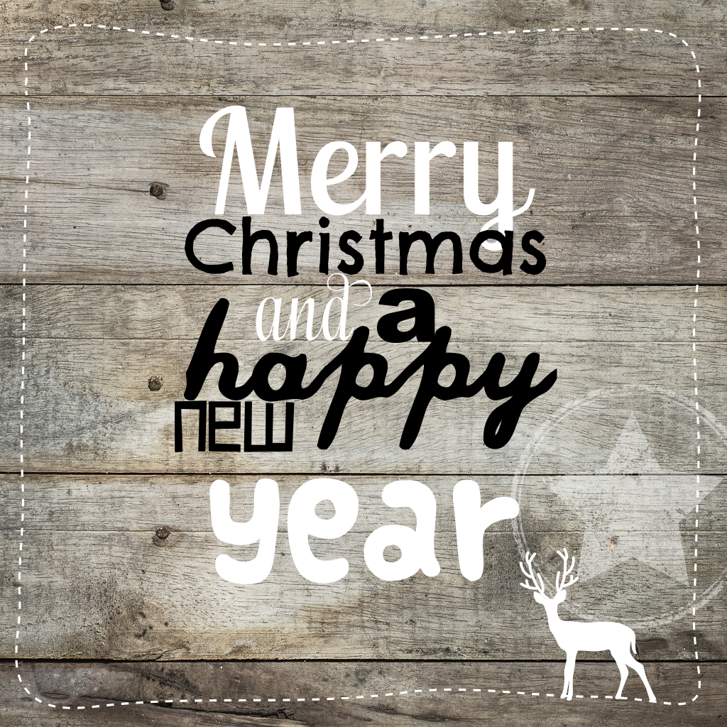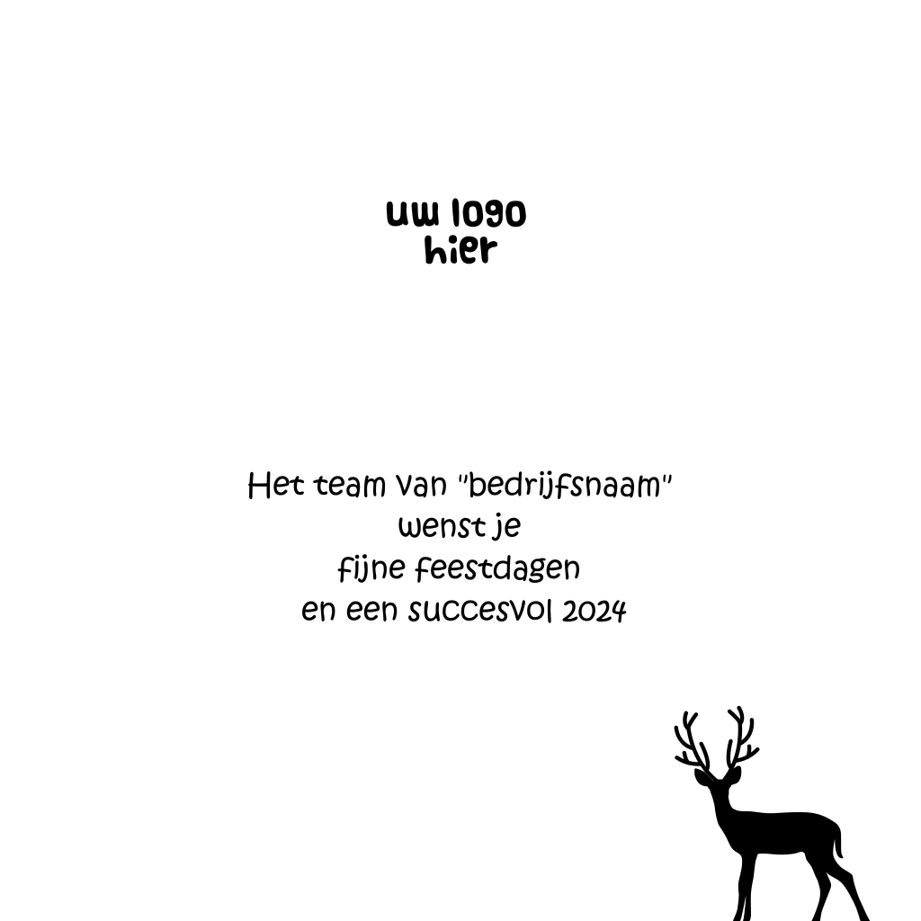 Deze stoere en sfeervolle kerstkaart heeft een houtachtergrond met een rand van witte streepjes en een silhouet van een rendier. Aan de binnenkant komt het rendier terug in het zwart. De tekst in zwart-wit combineert mooi met het hout. Merry Christmas and a happy Newyear!