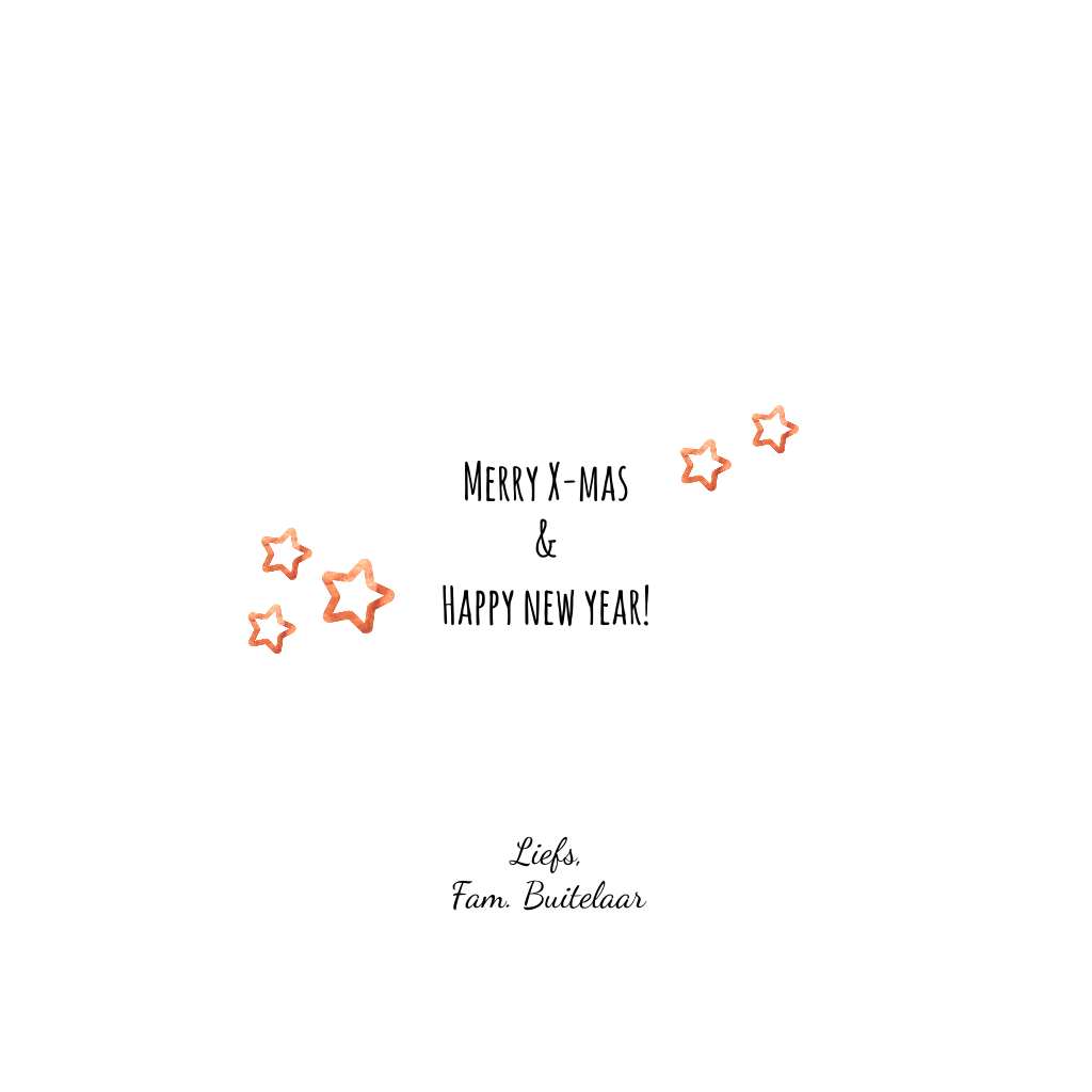 Deze stoere kerstkaart met houtachtergrond is versierd met kleine sterretjes en teksten en banners in koperkleur! Schrijf je eigen teksten, kies de lettertypes die jij mooi vindt en maak deze kerstkaart helemaal af!
