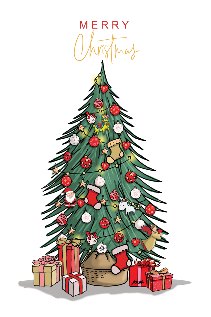 MERRY Christmas! Wens vrienden en familie fijne feestdagen met dit illustratieve kerstkaartje met een kerstboom vol kerstballen, -sokken, lichtjes en kadootjes.