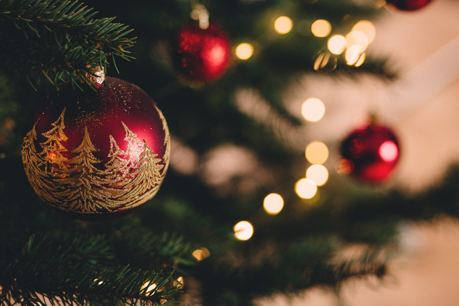 Rustige kerstkaart met kerstboom met kerstbal erin. Schrijf aan de binnenkant een kerstgroet voor je familie of zakenrelaties.