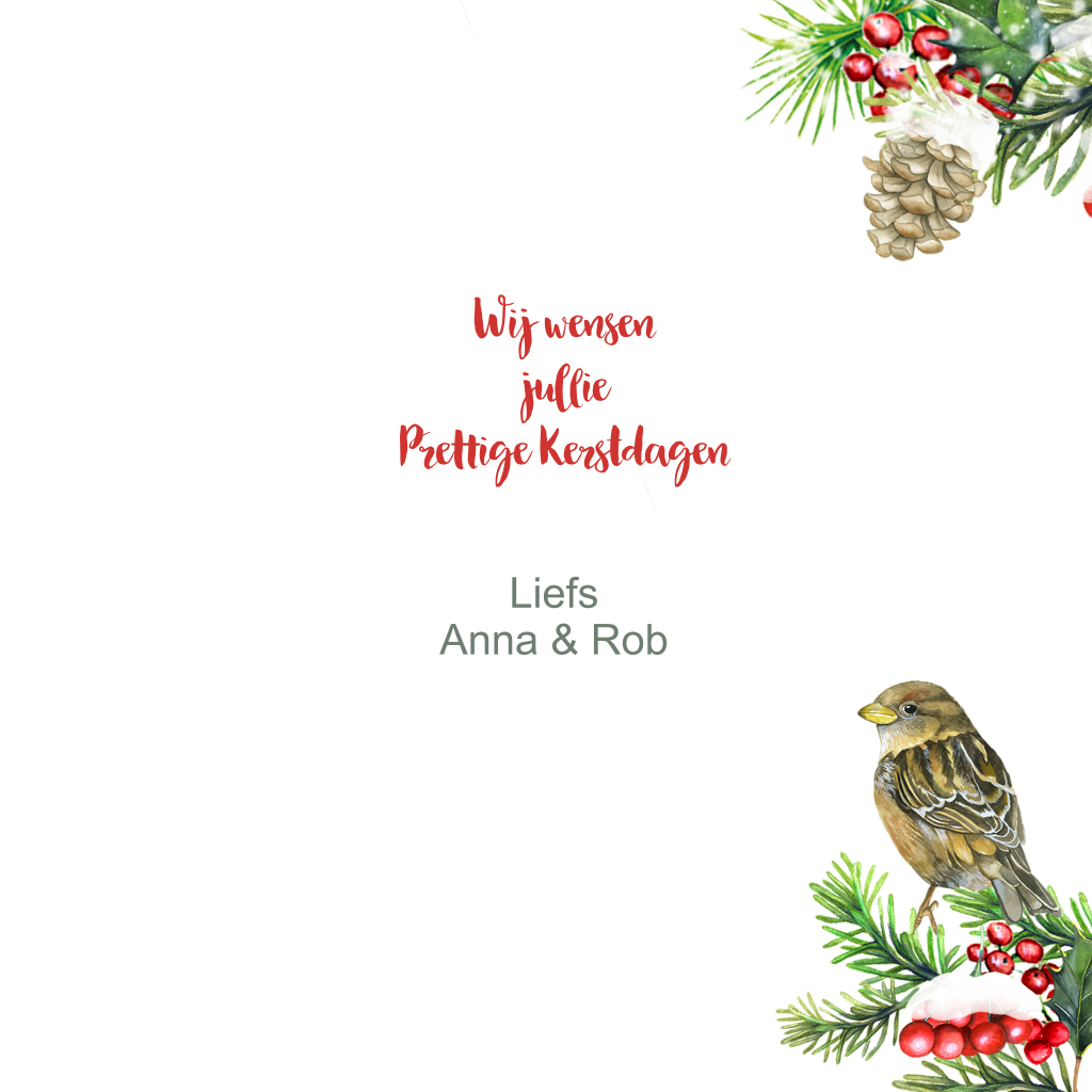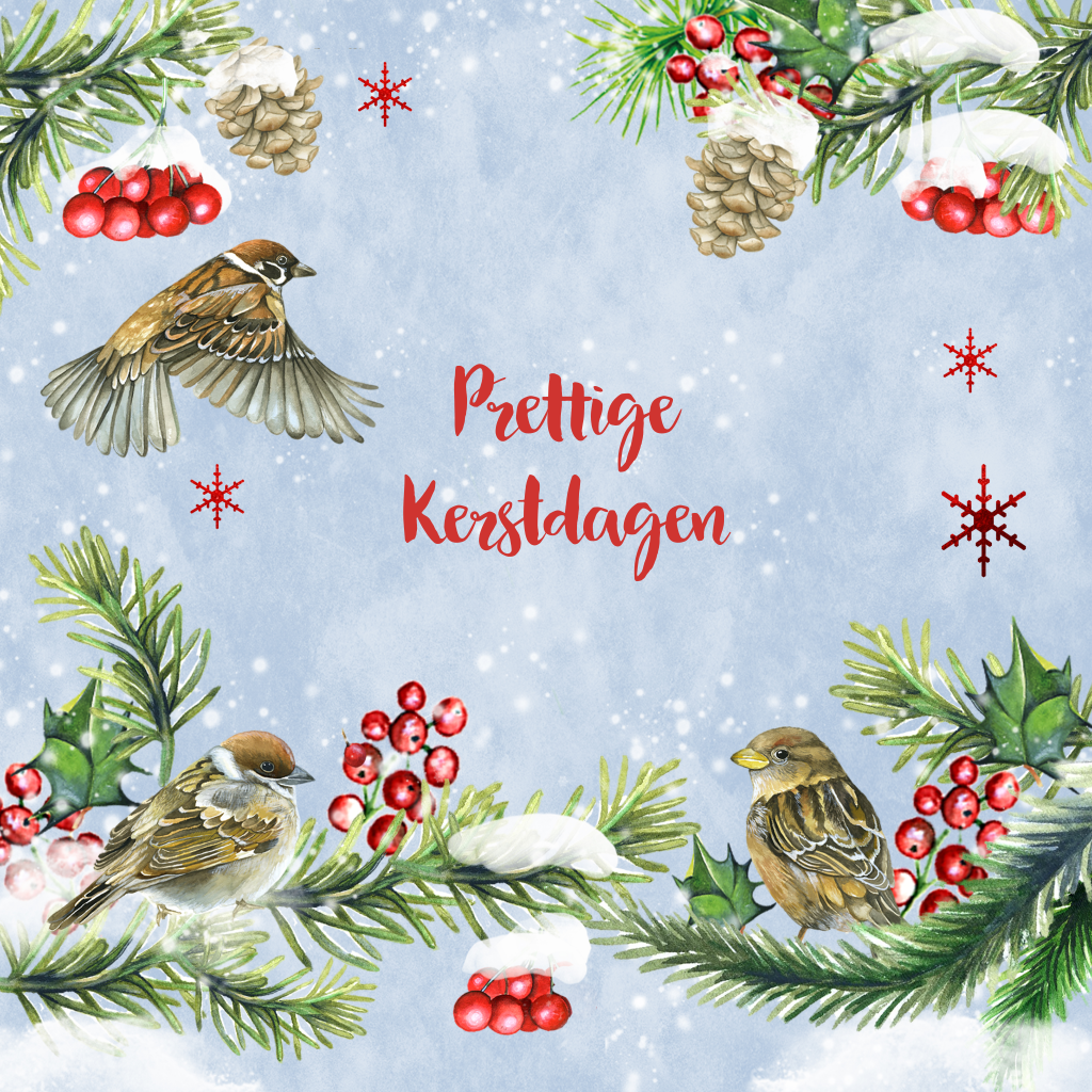 Klassieke kerstkaart met mussen die op de kersttakken met besjes en dennenappels zitten. De sneeuw maakt deze sfeervolle kerstkaart helemaal af!
