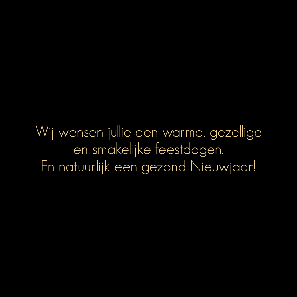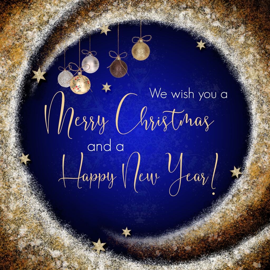 Een feestelijke en bovenal sfeervolle kerstkaart met kerstballen en gouden sterren.