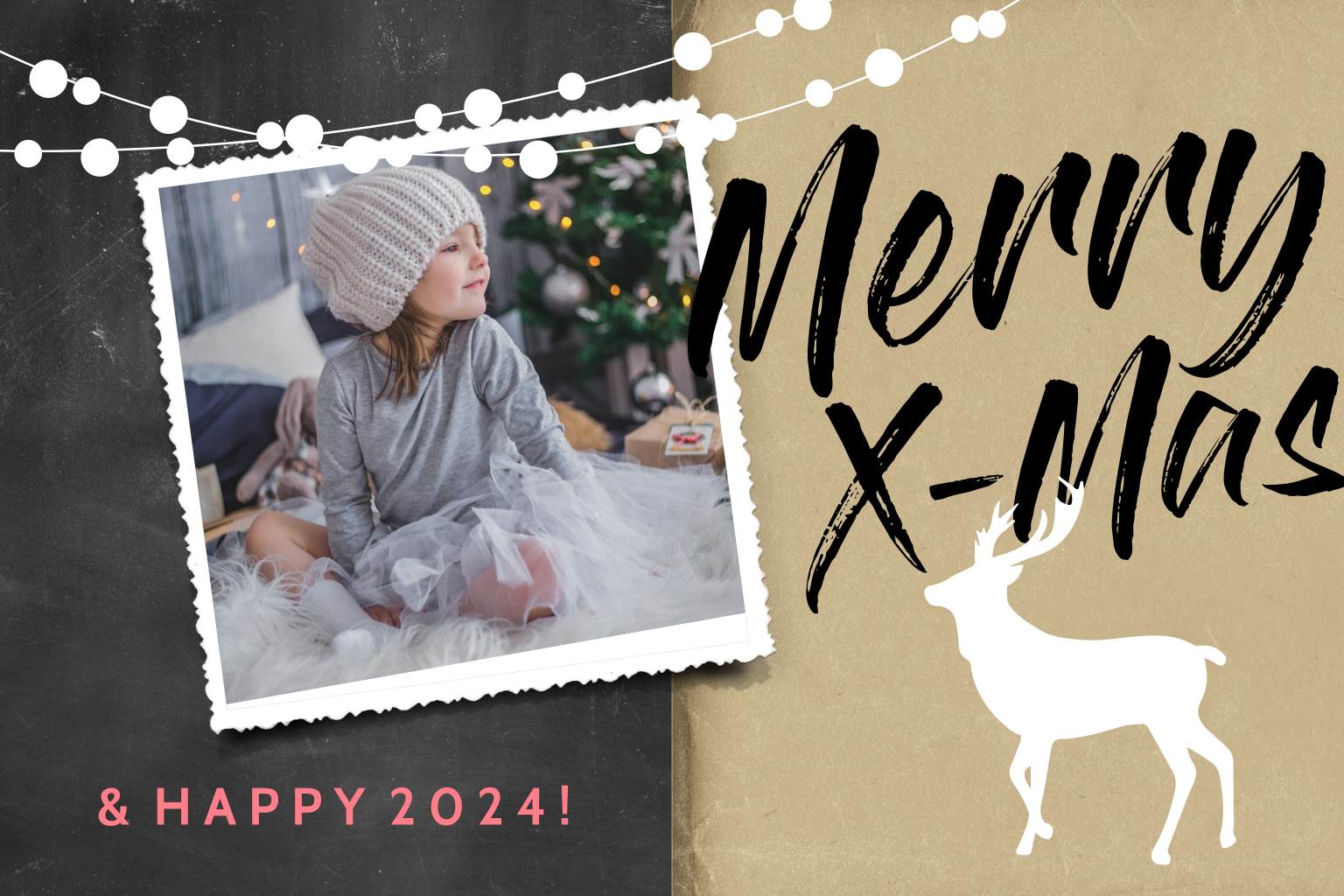 Merry X-Mas! Dit feestelijke kerstkaartje is versierd met een lampjesslinger, een silhouet van een rendier en een fotoframe. De achtergrondkleuren in bruine tinten geven dit kaartje een rustige uitstraling. Je kunt kleuren ook eventueel zelf aanpassen, als je dat wilt. Maak er een persoonlijke kerstkaart van!