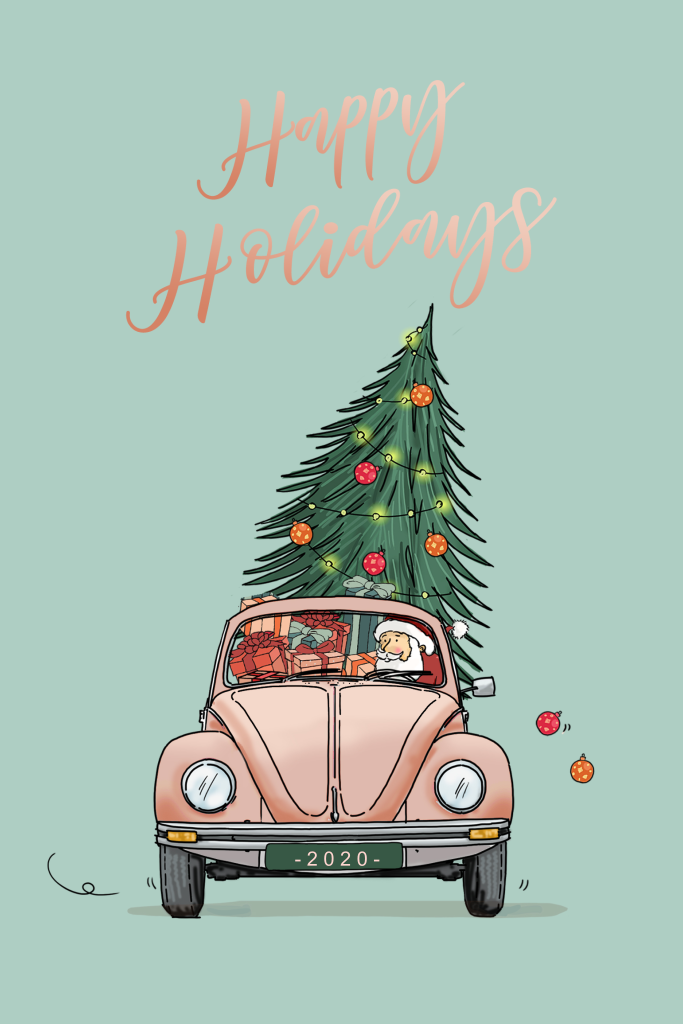 Vrolijke kerstkaart van een kerstman in een overvolle vw kever. In groene kleur, met sierlijke letters in oudroze. Je kan zelf de lettertype en de tekst aanpassen in de online editor. Wil je ook een andere achtergrondkleur dan kan dat natuurlijk ook.