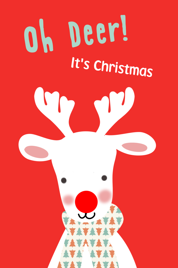 Oh deer it's christmas! Dit vrolijke, rode kerstkaartje heeft een rendier op de voorkant met een sjaal om, blosjes op zijn wangen en een rode neus. Grappig!