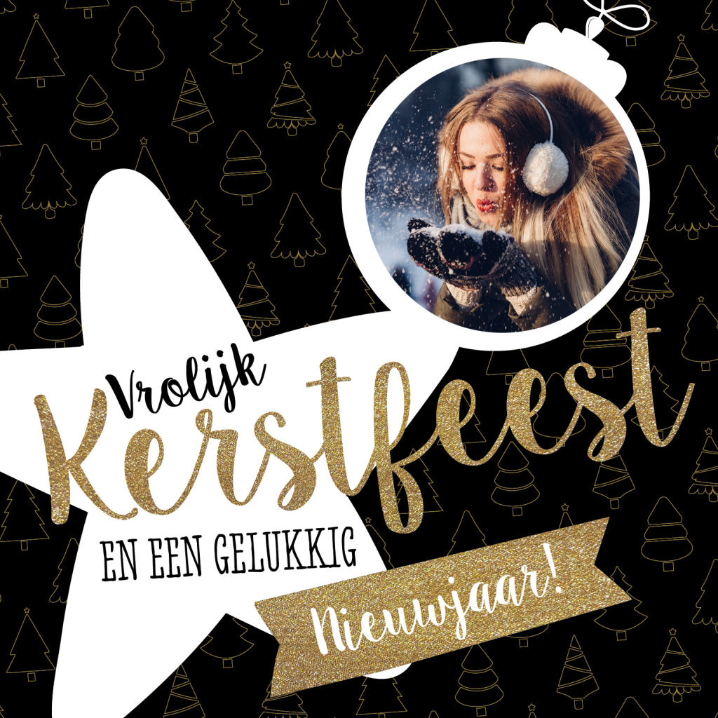 Een vrolijk kerstkaartje met een grote ster en een kerstbal waarin je een eigen foto kunt zetten! De achtergrond is gepimpt met kerstbomen. Vrolijk kerstfeest!