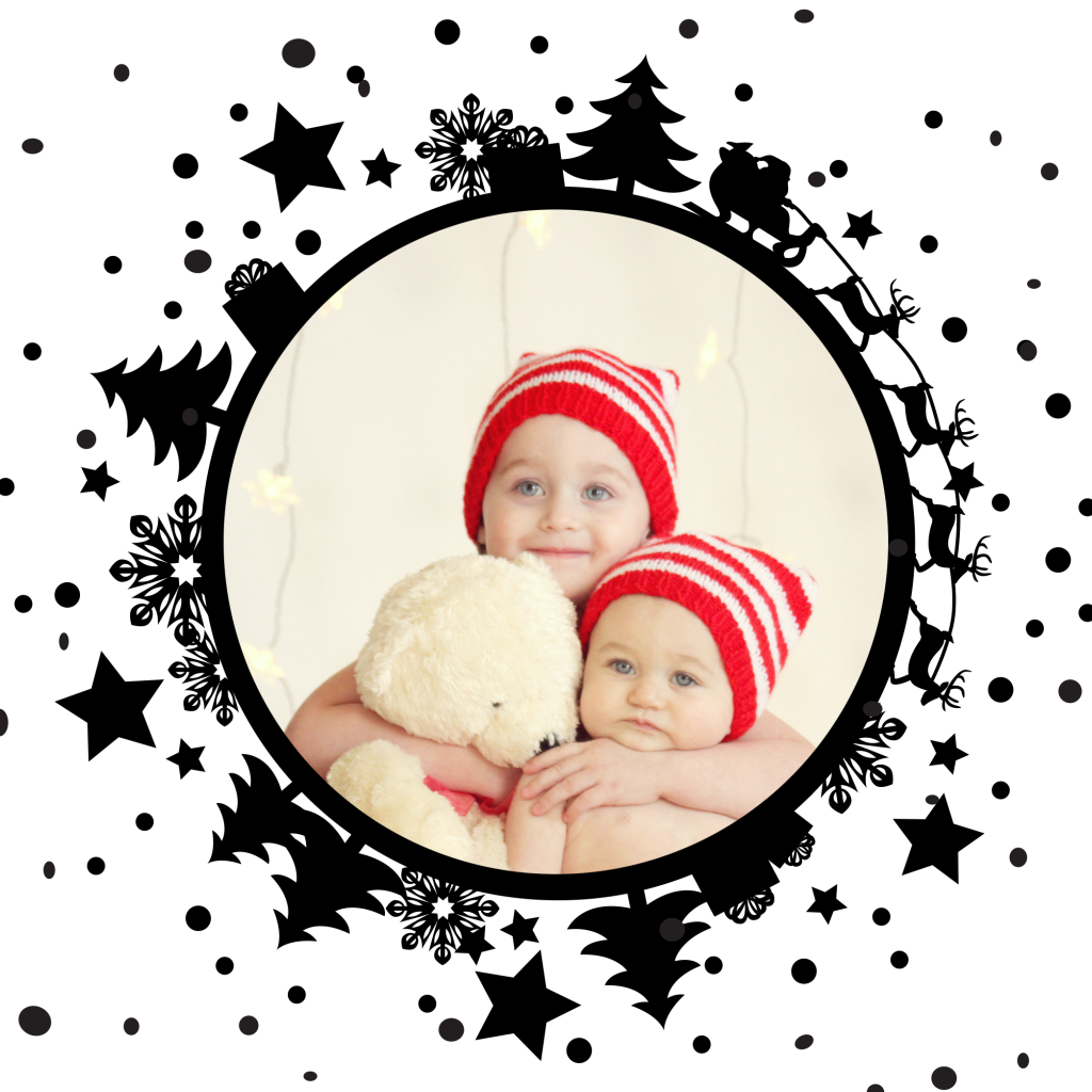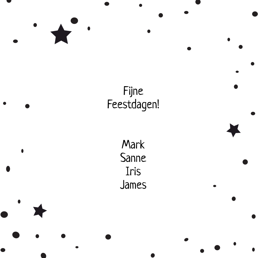 Een moderne kerstkaart in zwart-wit met een cirkel waarin je een persoonlijke foto kunt plaatsen. Leuk zijn alle kerstelementen om de cirkel heen: de kerstman in zijn slee met rendieren, kerstbomen, kadootjes en meer! De stippen en sterren op de achtergrond maken dit kaartje helemaal compleet!