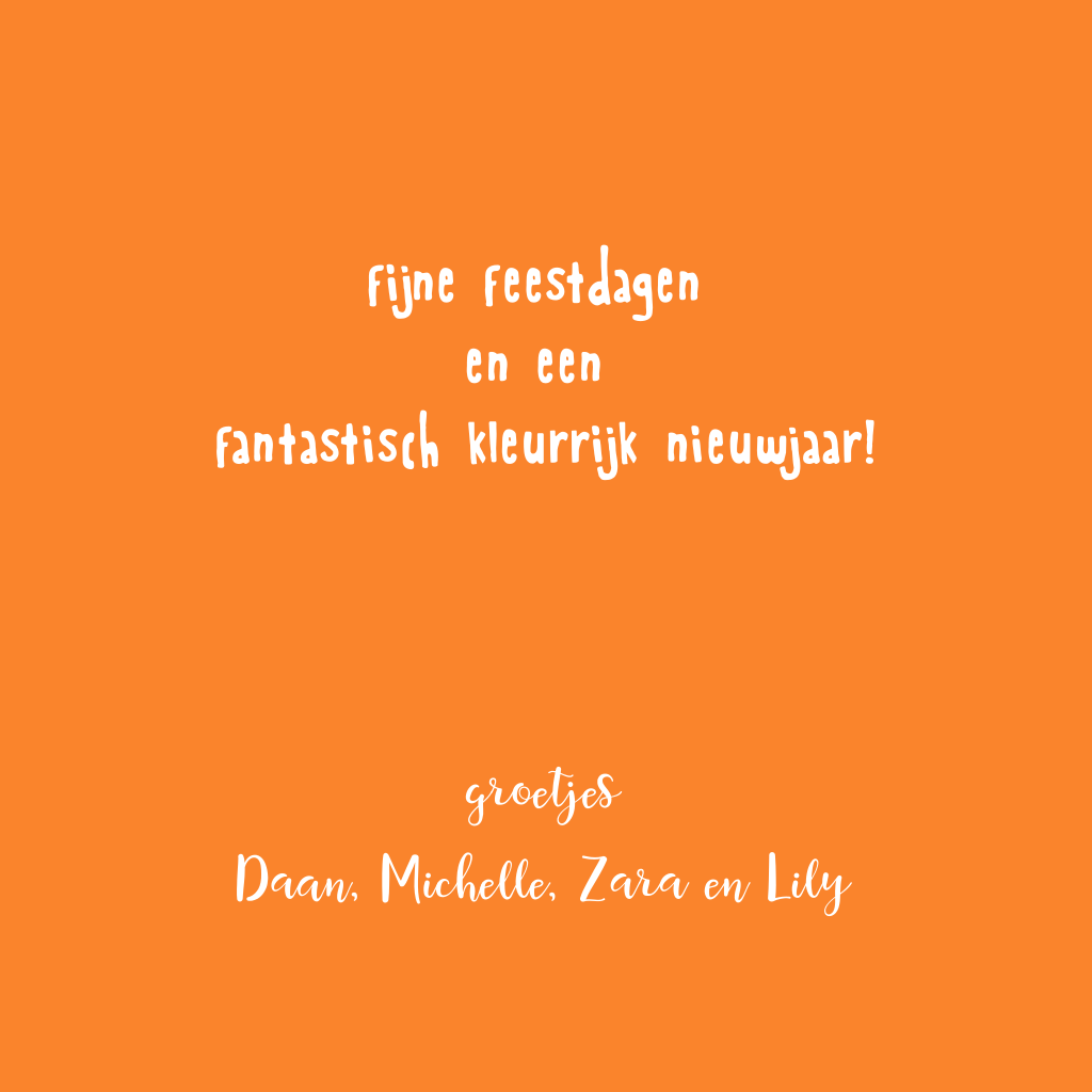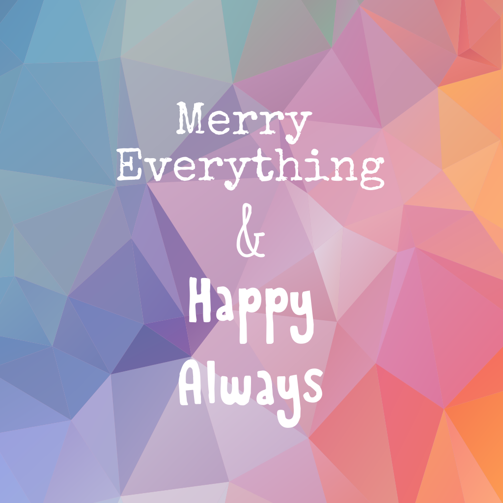Merry Everything & Happy always, wat een originele tekst voor op je kerstkaart! Deze hippe, unieke kaart heeft een geometrisch achtergrondpatroon van verschillende vlakken in blauw, paar, roze en oranje die heel mooi qua kleur in elkaar overlopen. Plaats eventueel een eigen foto aan de binnenzijde en maak hem helemaal af!