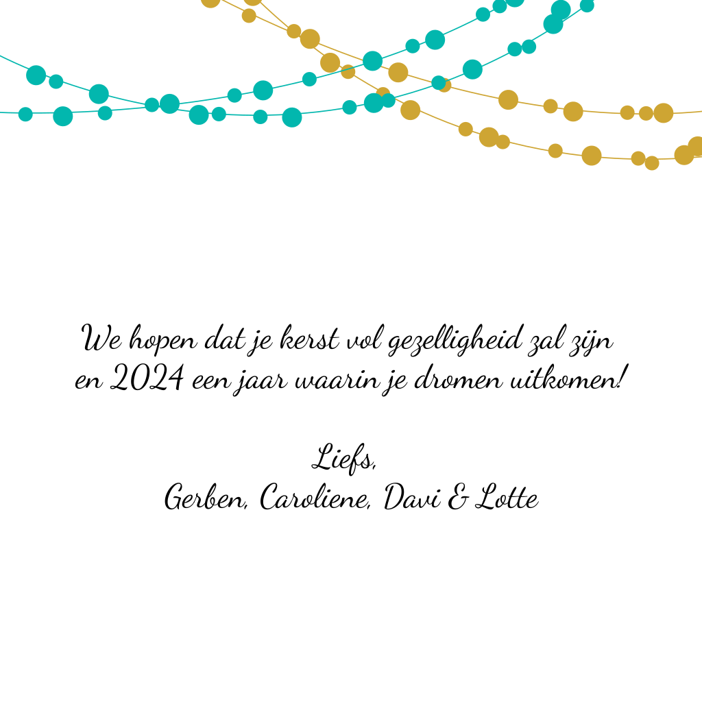Hippe kerstkaart met een krijtbordachtergrond en lampjesslingers en sneeuwvlokken in wit en aquablauw. Ook tof is de schitterende, goudkleurige tekst merry christmas. Kijk ook eens aan de binnenkant; daar kun je een leuke foto toevoegen!