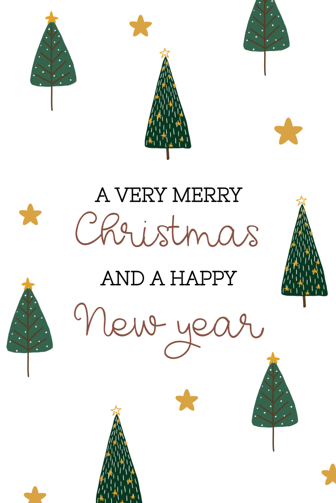 Een stijlvolle en originele kerstkaart met verschillende kerstbomen en sterretjes.