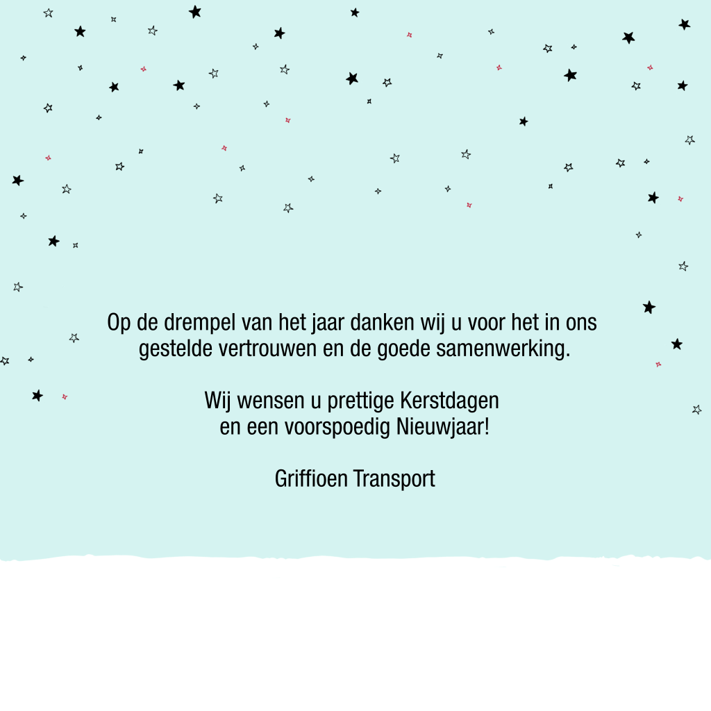 Wat een stoere kerstkaart met deze zwarte wagen op een mintgroene achtergrond met sterren! Het busje is gepimpt met allerlei teksten in hippe lettertypes. Op een succesvol Nieuwjaar!