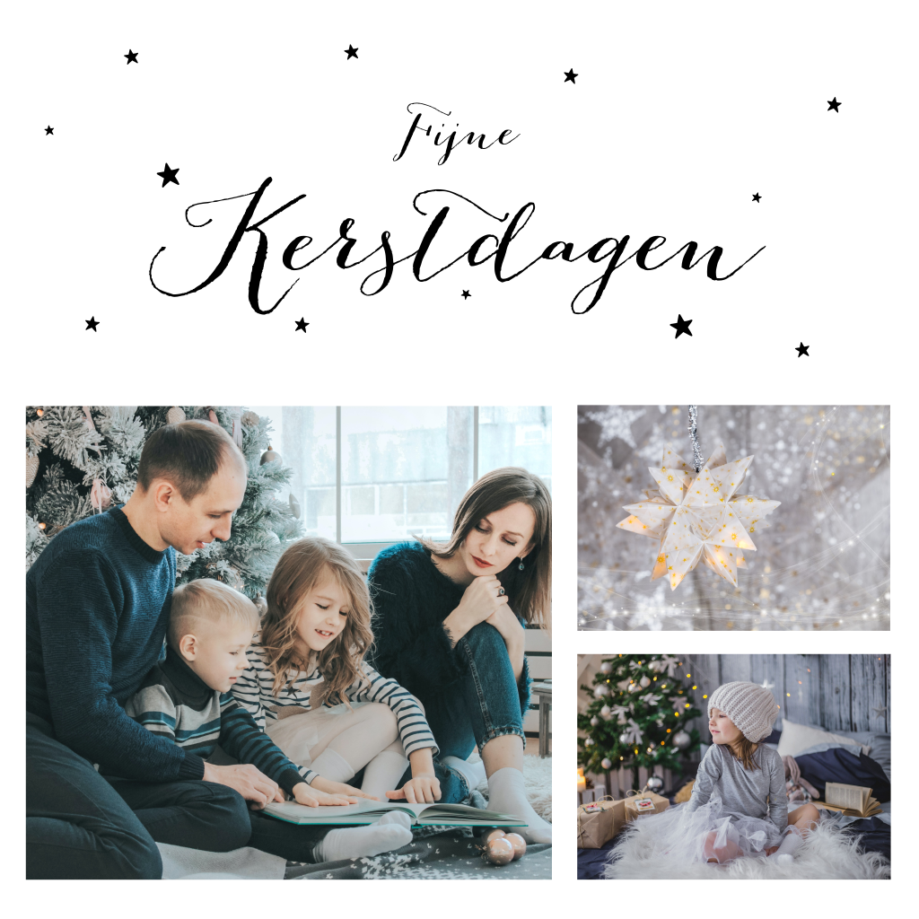 Maak een persoonlijke kerstkaart met eigen foto's. Door de witte achtergrond, sierlijke letters en kleine sterretjes is deze kaart super hip! Wist je dat je de teksten en kleuren op de kaart nog helemaal naar wens aan kan passen in de online editor?