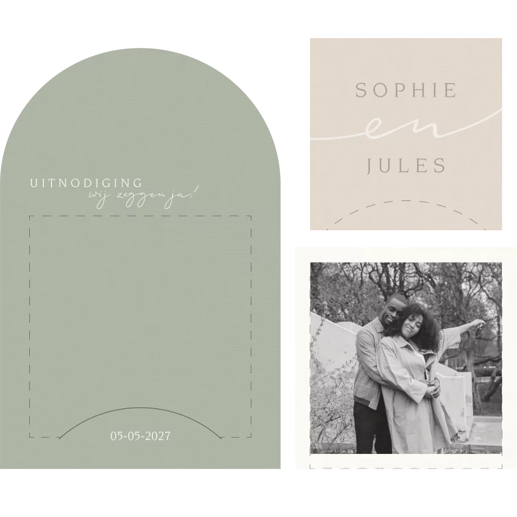 Originele labeltrouwkaart in boogvorm met zachte pastelkleuren olijf en roze, de tekst staat in trendy lettertypes in wit. Upload een leuke foto op het vierkante kaartje en maak de kaart persoonlijk in de online editor.