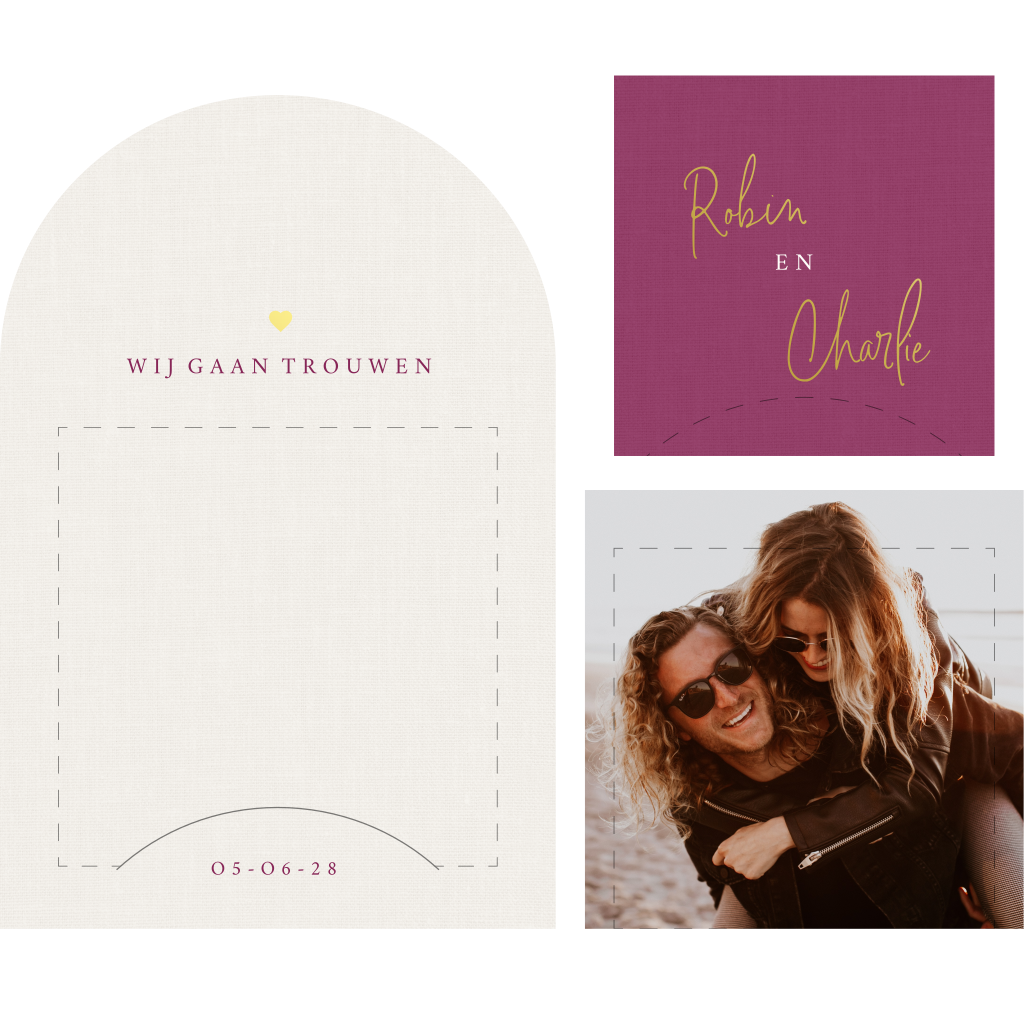 Origineel, deze labelkaart in boogvorm om jullie bruiloftsgasten uit te nodigen! De boogvorm is in pastelkleur, het vierkante kaartje is in fuchsia met tekst in goudfolie. Op het andere kaartje kun je een leuke eigen foto uploaden, maak de kaart persoonlijk in de online editor.