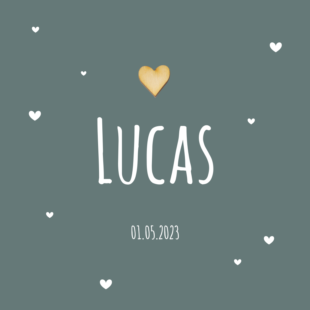 Lief geboortekaartje met ronde hoeken voor een jongen. Op het geboortekaartje zie je hartjes en midden-boven ook een hartje van echt hout. Deze kun je er zelf bij kopen.