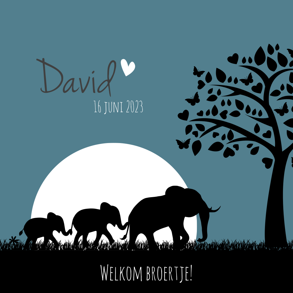 Wat een lieve geboortekaart voor de geboorte van jullie zoon! De silhouetten van olifanten staan voor de maan. De boom met vlinders en de ronde hoekjes maken deze kaart extra schattig.