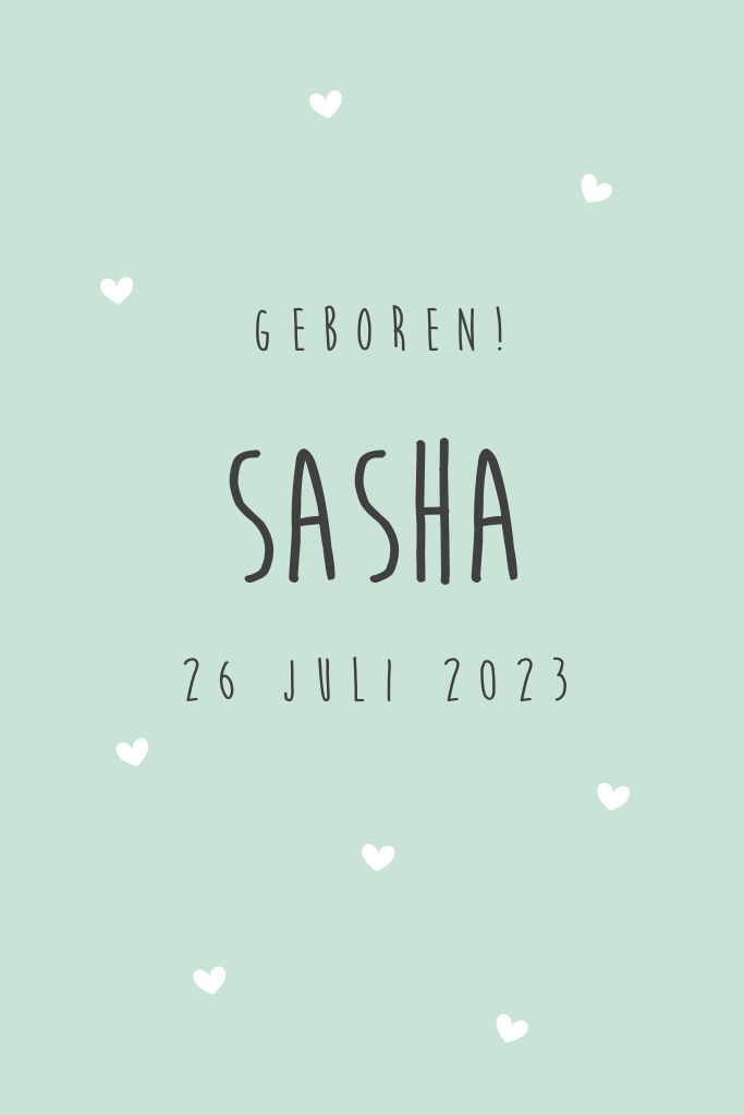 Schattig babykaartje met witte hartjes op een mintgroene achtergrond. De ronde hoekjes geven een extra zachte uitstraling aan deze kaart.