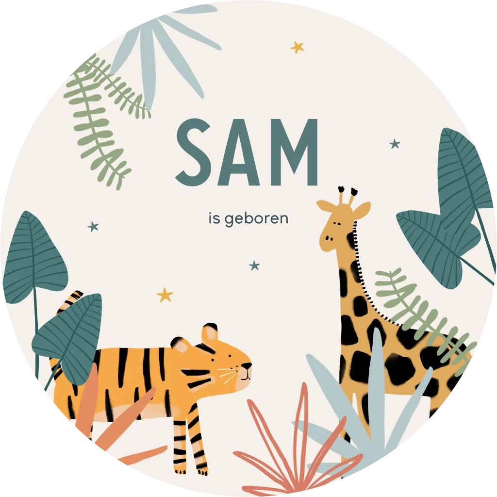 Origineel, dit stoere geboortekaartje voor een zoontje! Op het ronde kaartje staan een tijger en een giraffe in een jungle van groene en blauwe takken onder een sterrenhemel. Pas het kaartje naar wens aan in de online editor en bestel een proefdruk.