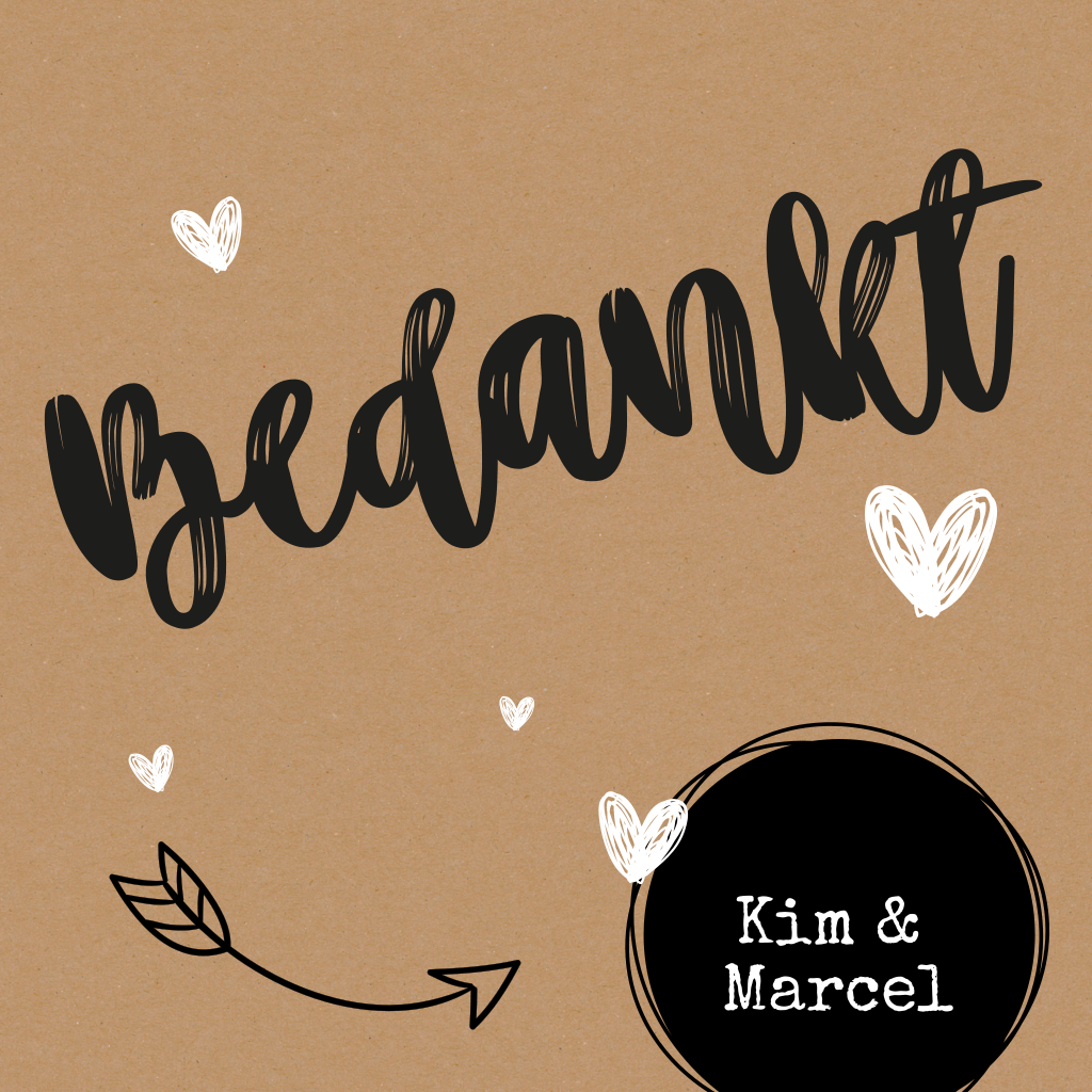 Stoere bedankkaart bruiloft met de tekst "bedankt" in hippe typografie op een kraft papier-look achtergrond. De getekende hartjes en pijltjes maken dit kaartje helemaal af!