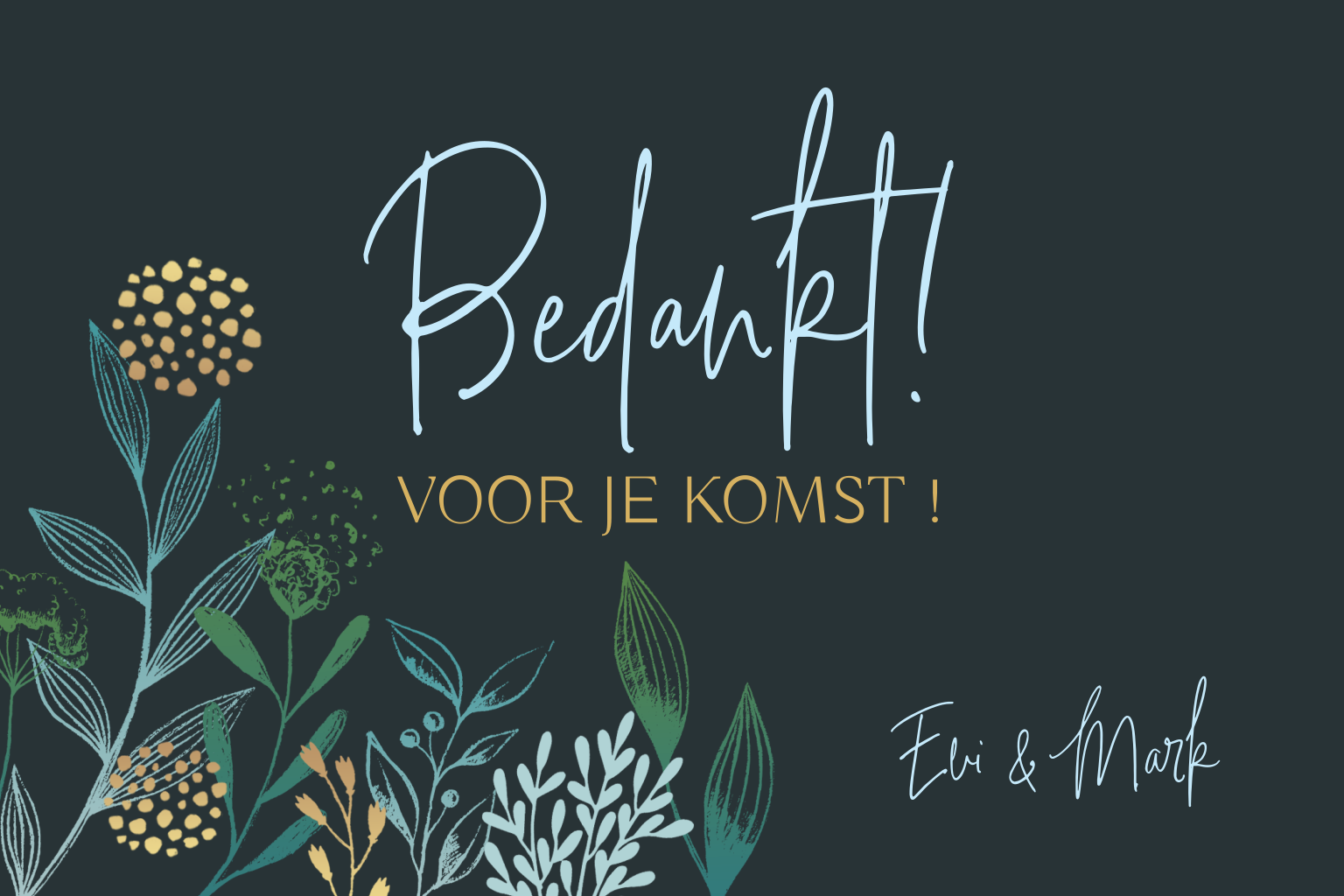 Stijlvolle bedankkaart met takjes en bloemen op een donkere achtergrond. Bekijk ook onze bijpassende save the date kaart en trouwkaart.