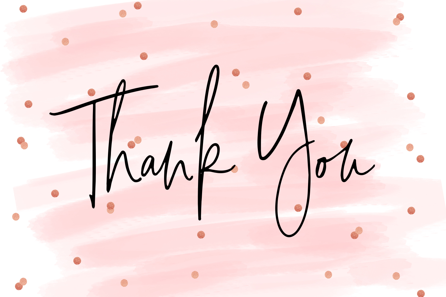 Een mooie bedankkaart voor de huwelijksgasten in roze aquarel. De koperkleurige stippen maken deze hippe kaart extra vrolijk! Pas zelf de teksten aan.