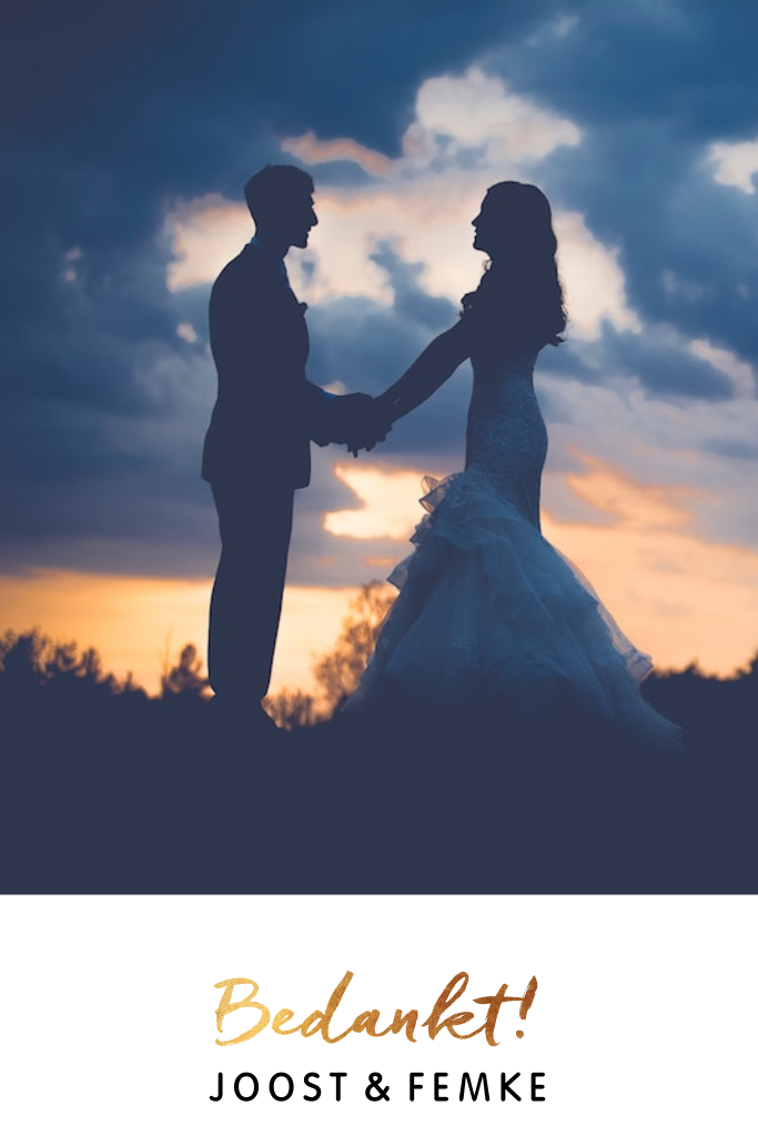 Was jullie trouwdag onvergetelijk? Maak een bedankkaartje voor alle gasten en voeg een persoonlijke foto toe! Speciaal aan dit kaartje zijn de goudkleurige letters met de tekst 'Bedankt!'. Kleuren en lettertypes zijn naar wens aan te passen in de online editor.