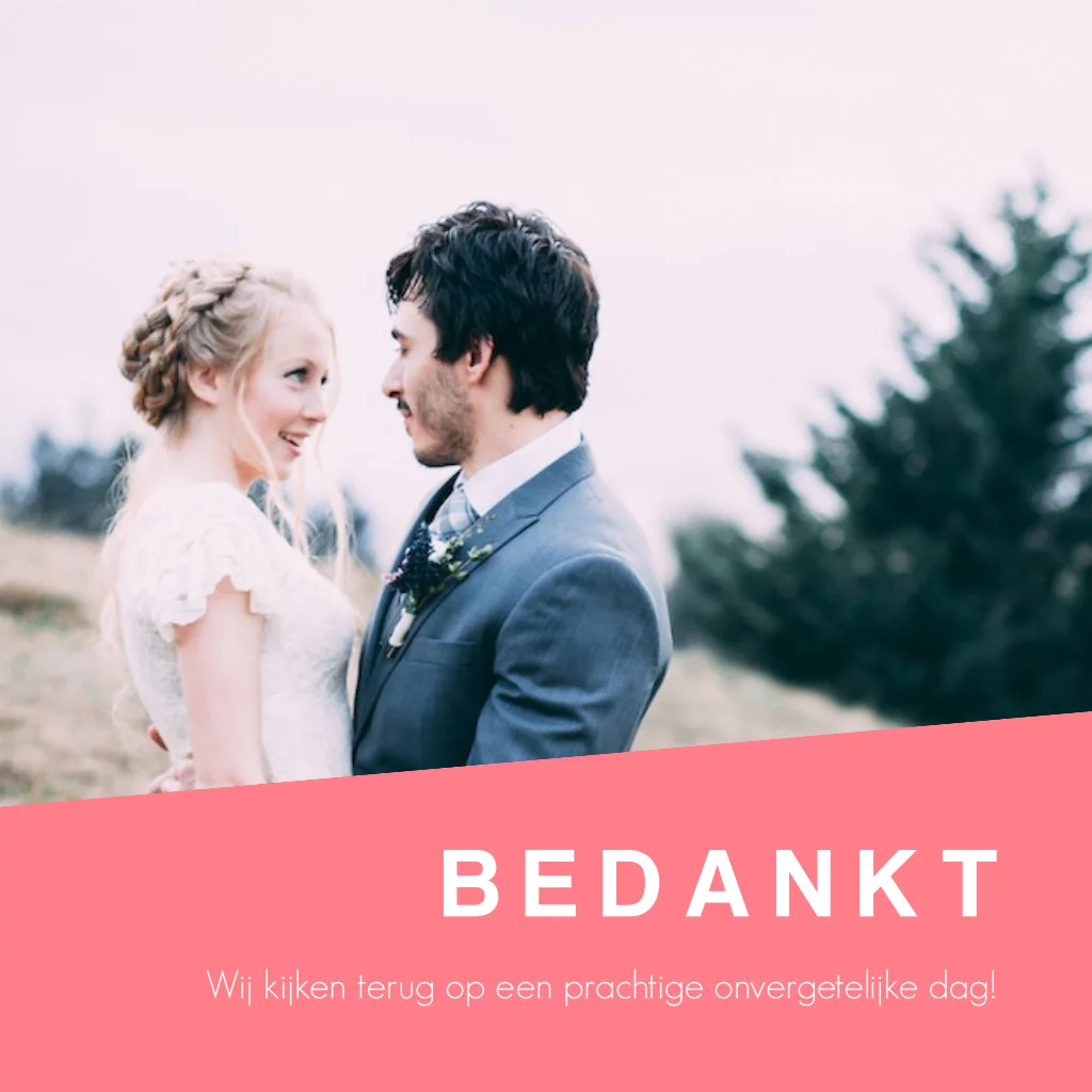 Een vierkant bedankkaartje om je dankbaarheid te betuigen aan iedereen die aanwezig was op jullie trouwdag! De felroze kleur geeft dit kaartje echt een boost. Voeg een leuke foto toe en stuur hem op de post!