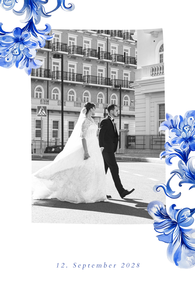 Bedankkaart in stijl van de trouwkaart met Delfts blauwe illustratie van bloemen in de hoeken en tekst in bijpassende kleuren. Op de voorkant kun je jullie mooiste foto uploaden, ga naar de online editor en maak de kaart persoonlijk.