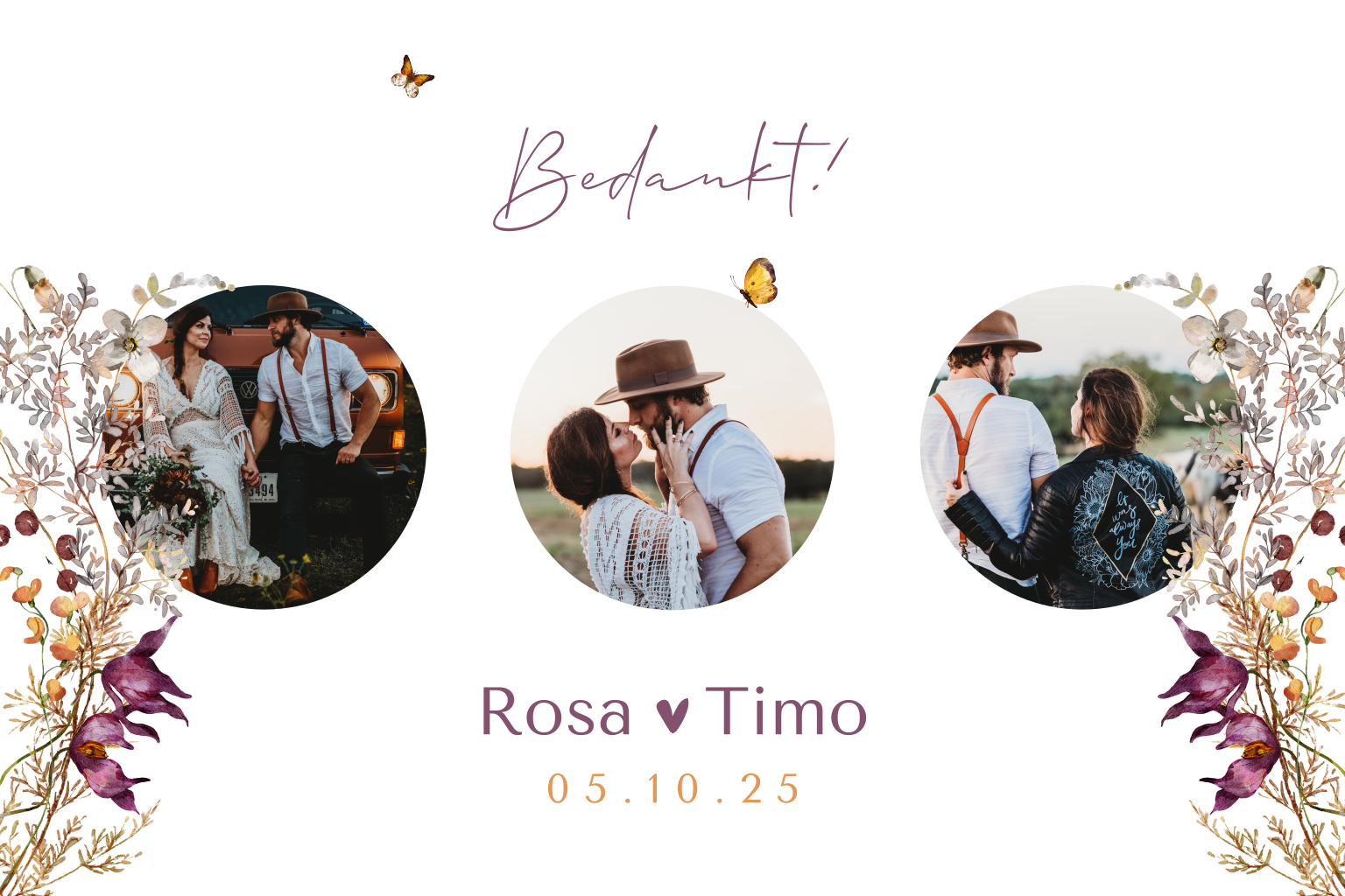 Bedank jullie bruiloftsgasten met deze unieke kaart in de stijl van de trouwkaart: in de drie cirkels kun je jullie mooiste foto's uploaden. Langs de rand en op de achterkant de veldbloemen in roze en de hartjes en hartjes en vlinders.