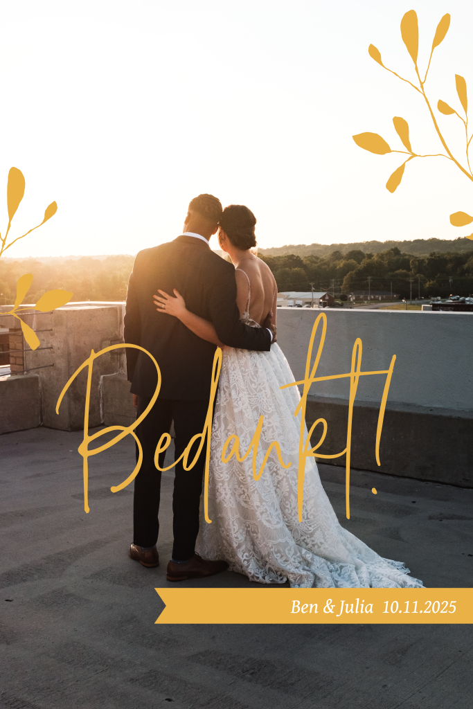 Een hippe bedankkaart met ruimte voor jullie mooiste foto op de voorkant. Het design bestaat uit een sierlijk lettertype, een takje en een banner. De kleur van het kaartje is okergeel. In onze online editor kun je de tekst personaliseren en de kleur naar wens aanpassen.