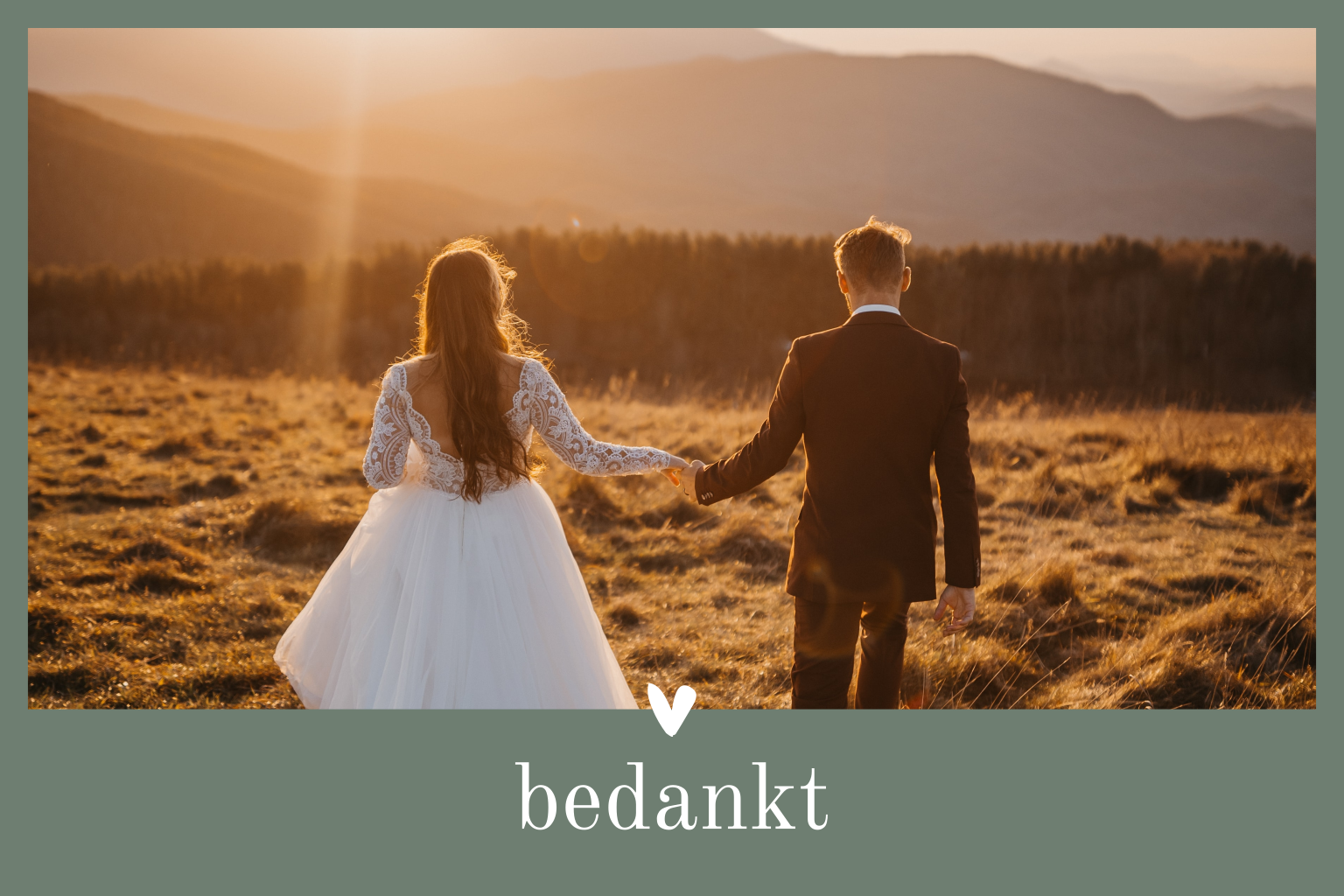 Op deze stijlvolle bedankkaart plaats je jullie mooiste foto op de grijsgroene, olijfkleurige achtergrond. Het kleine hartje zorgt voor een romantisch accent. De tekst op de achterzijde is in dezelfde kleur groen, zo wordt het een mooi geheel. Maak de kaart compleet in onze online editor en verras familie en vrienden met een persoonlijk bedankje!