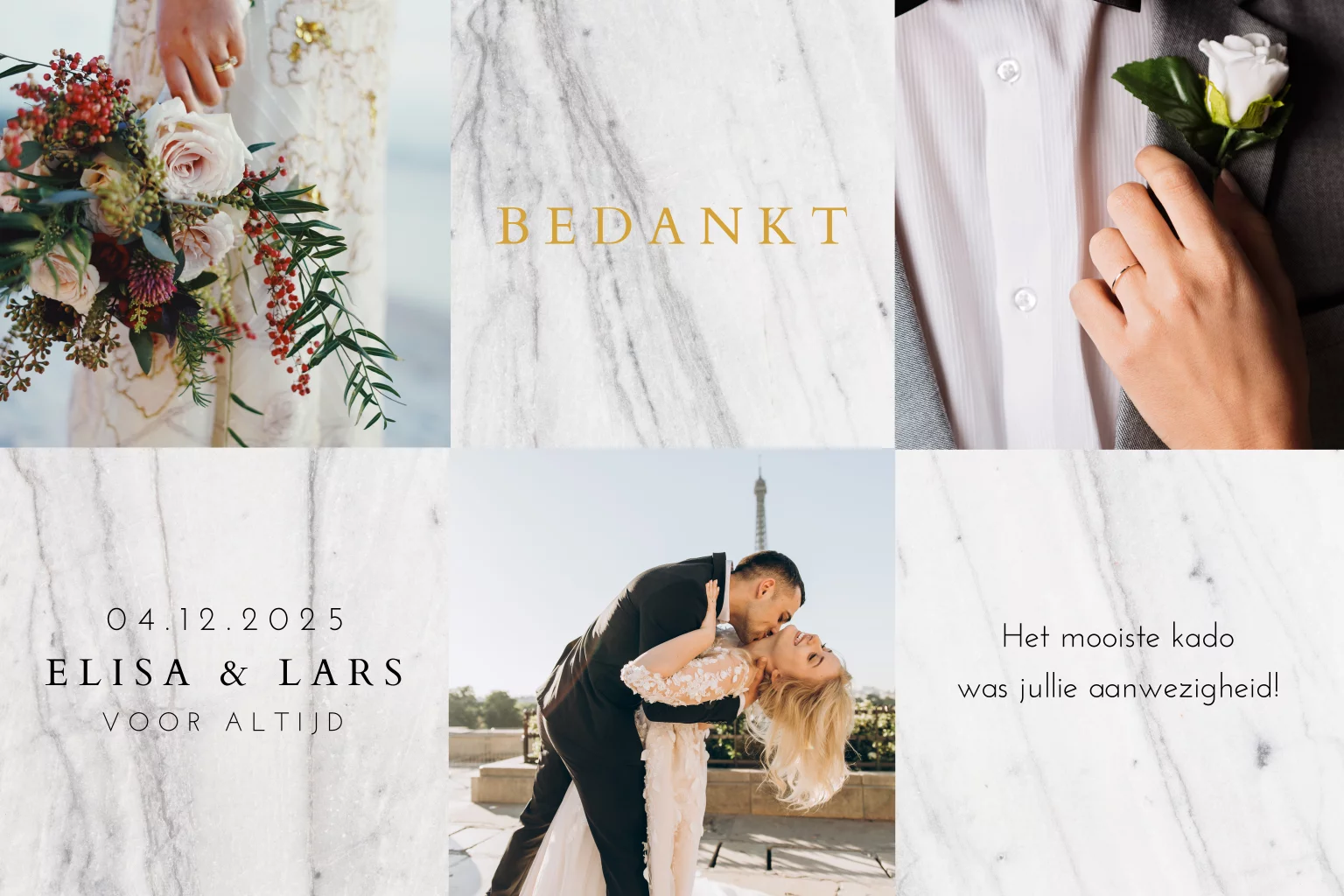 Super trendy bedankkaart met persoonlijke foto's van jullie bruiloft en marmer-look achtergond.