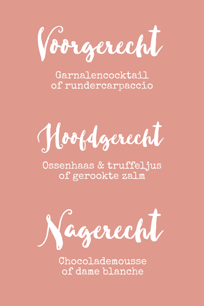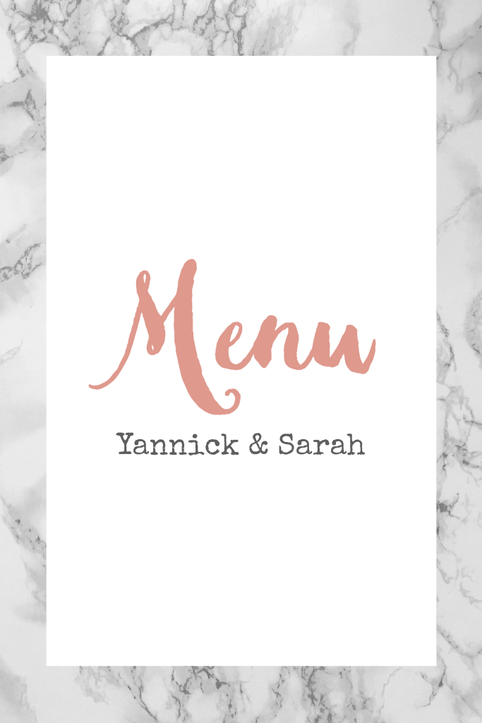 Mooie menukaart met marmer and sierlijke, roze letters. Teksten kunnen in de online editor worden aangepast.