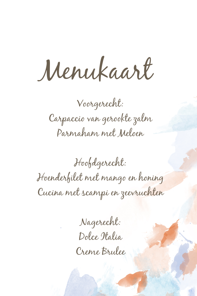 Staande menukaart voor een bruiloft. Plaats de tekst op de achtergrond in watercolor-look.