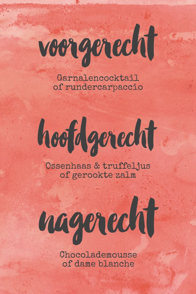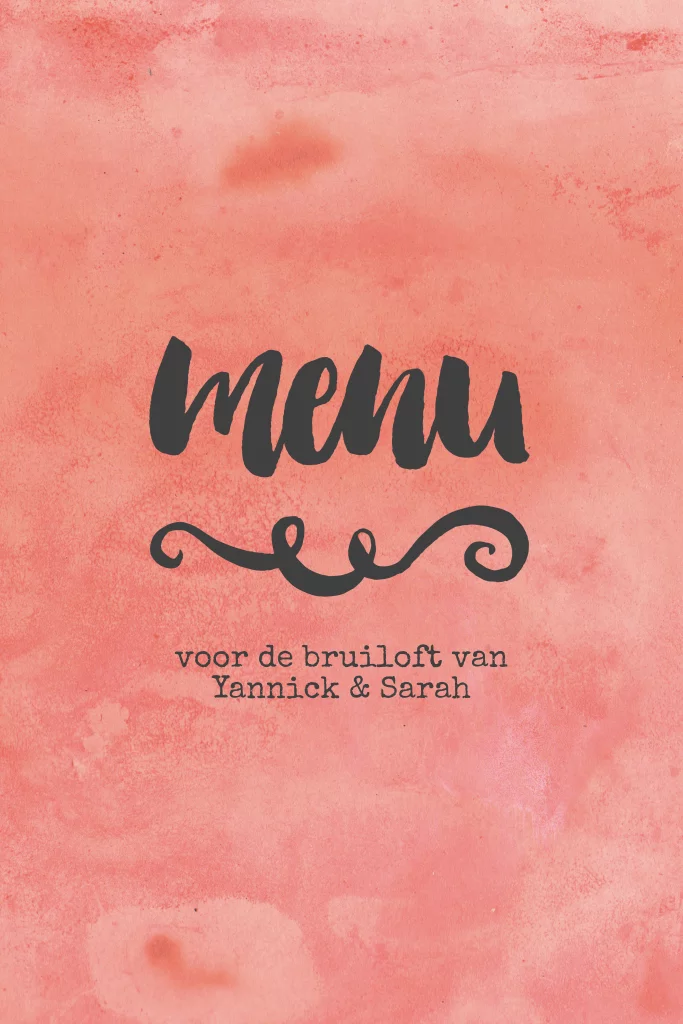 Vrolijke menukaart met een achtergrond van roze rode watercolor. De teksten pas je makkelijk zelf aan in de online editor. Zo maak je een mooie menukaart die helemaal past bij jullie diner!