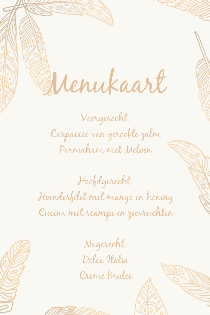 Wat een hippe menukaart voor jullie bruiloft met mooie bladeren! De tekst kan makkelijk aangepast worden in de editor.