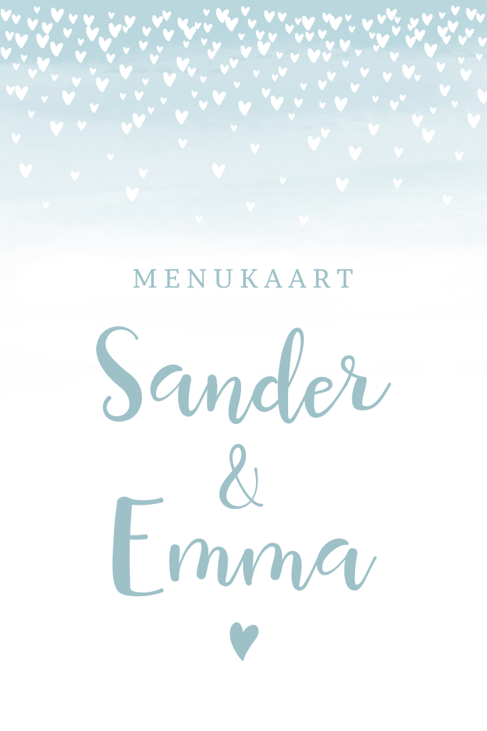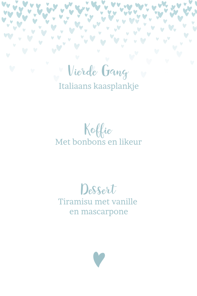 Een romantische menukaart in mint met hartjes en aquarel. Leuk voor een bruiloft! Pas zelf de teksten aan.